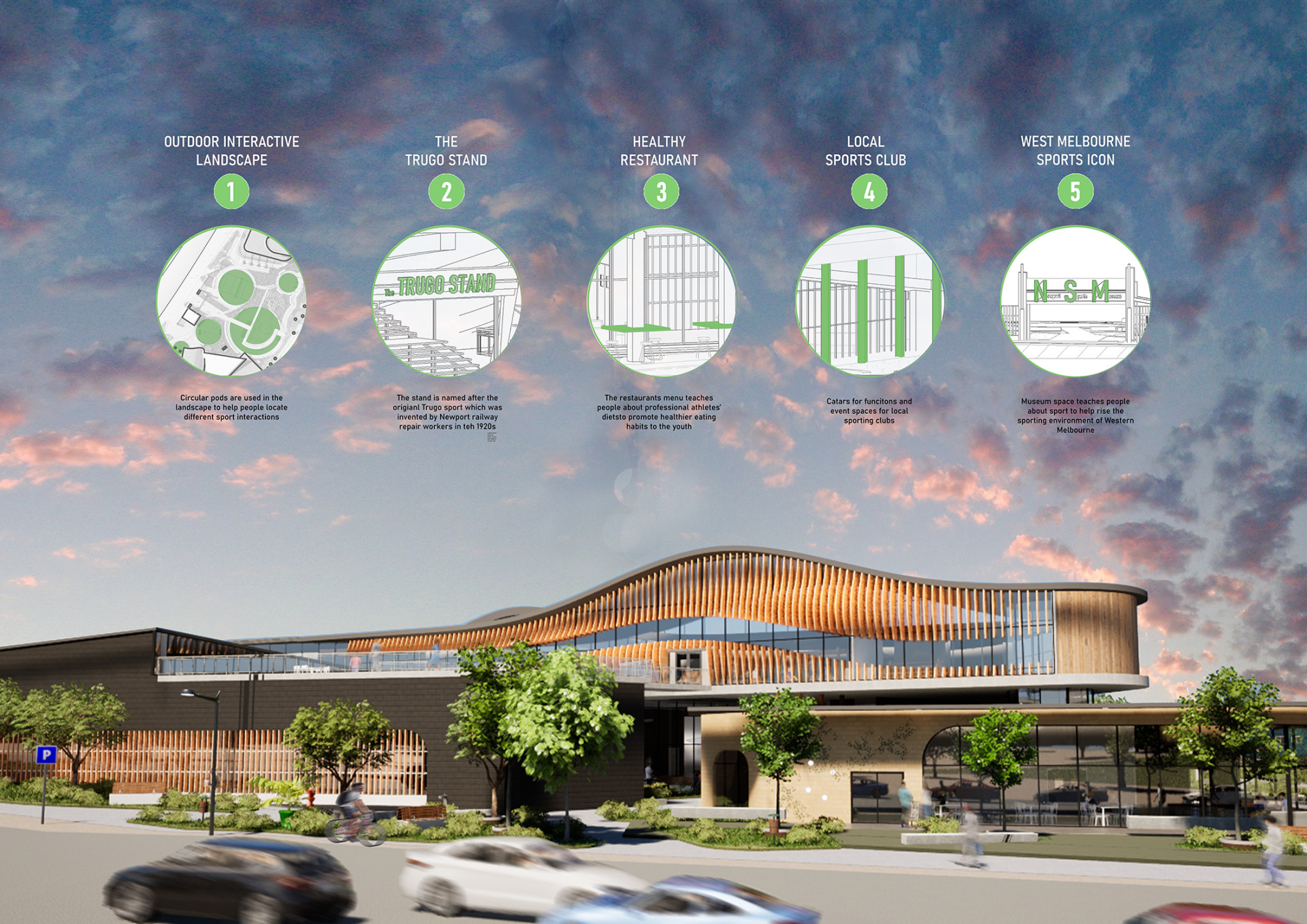 It is our mission to promote the enjoyment of sport to the Australian Youth. We want to improve the knowledge of sport so that people will feel more engaged to participate at a younger age. NSM demonstrates innovation through unique features of outdoor interactive sports spaces, grandstands that view outwards onto the football ground across the road and a room to cater for local sporting clubs. The design strikes with character with its wavy like roof structure that folds down to the ground creating a distinct identity which is recognisable to Melbourne.