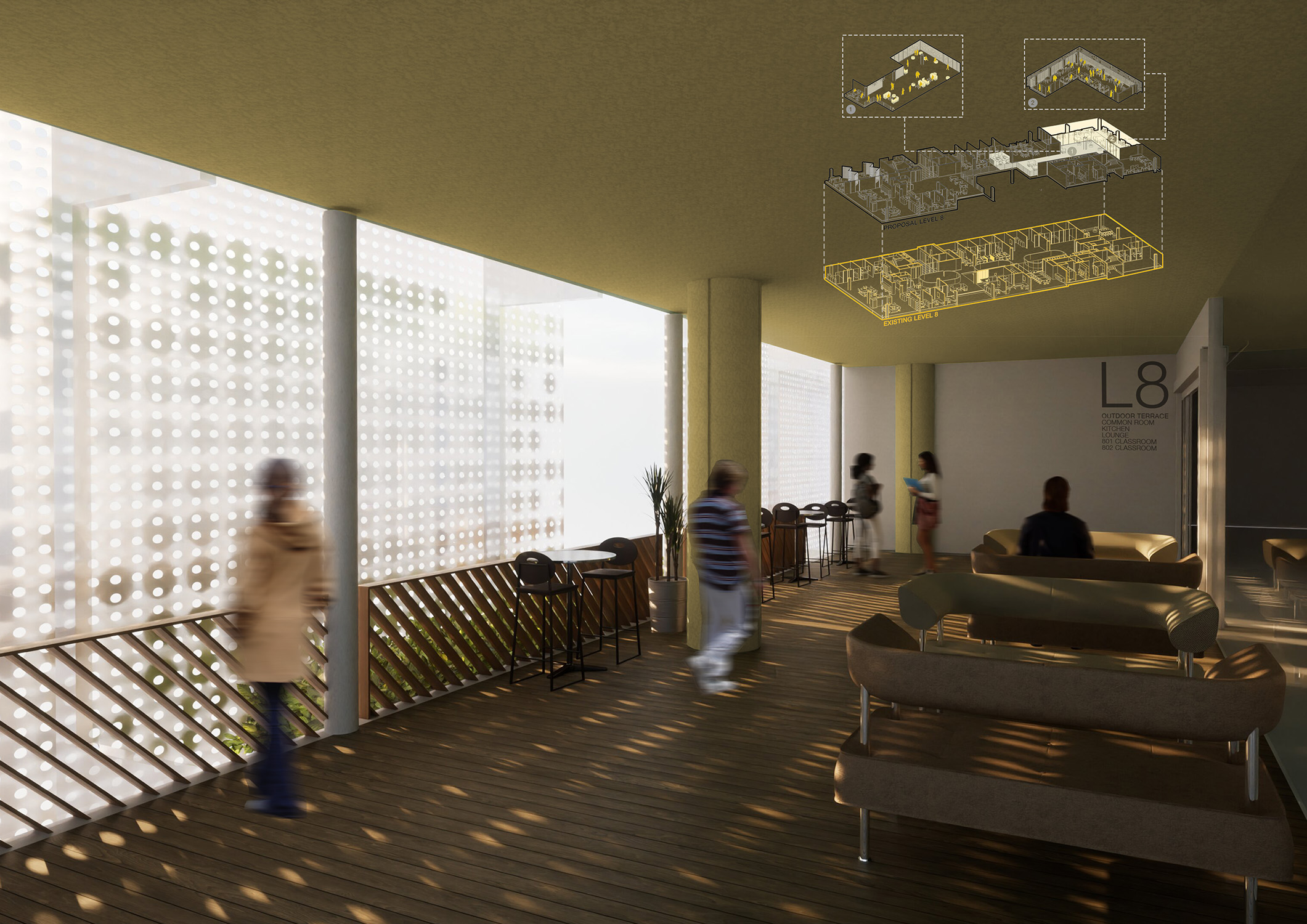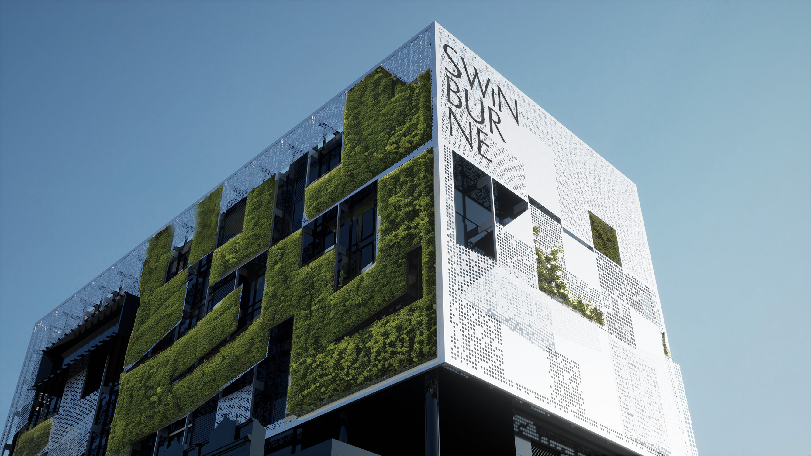 This is our proposal for the new renovation of the current Architecture building AMDC. The exterior facade acts as a protective layer allowing appropriate shading to outdoor terraces that we provide. We maximise airflow to these locations via our perforated panelling system to cool down study rooms for students. We wanted to include greenery along the facade to improve the air quality and be environmentally friendly. Swinburne is still printed onto the facade to help keep its identity.