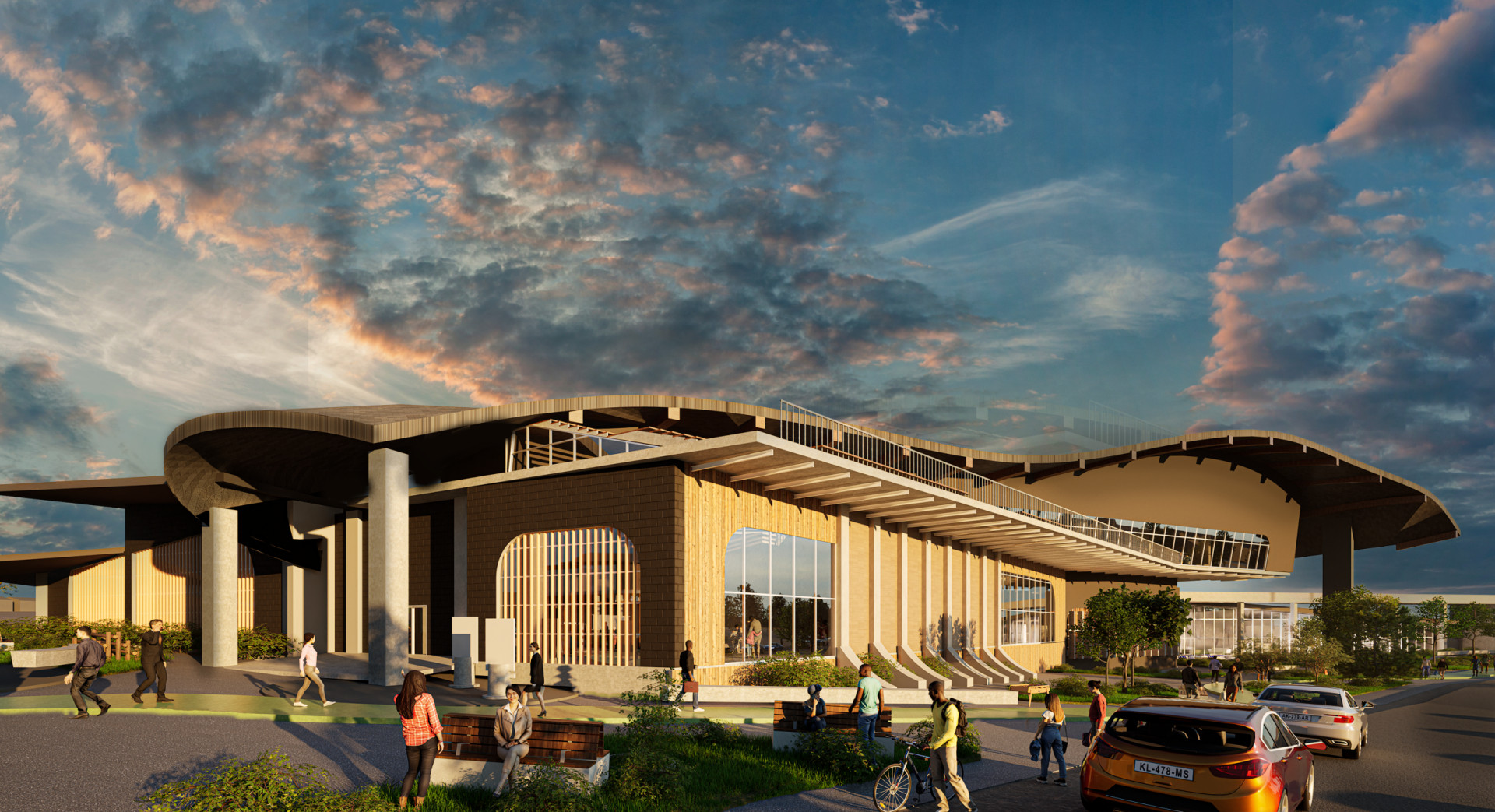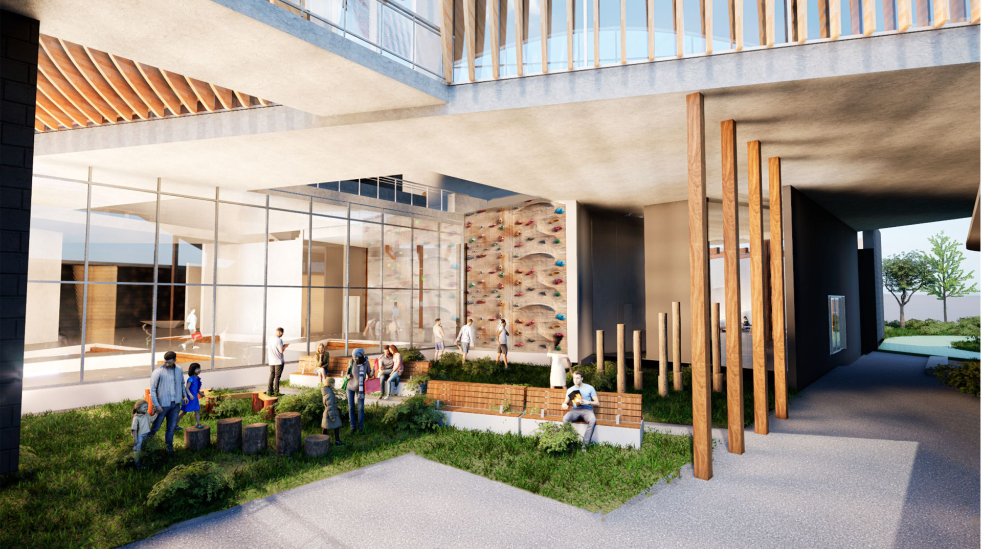 A part of the same project, here shows a relaxation space of the museum alongside a rock climbing wall. We aimed to create an interactive space that can rekindle the passion for sport, especially in the youth.