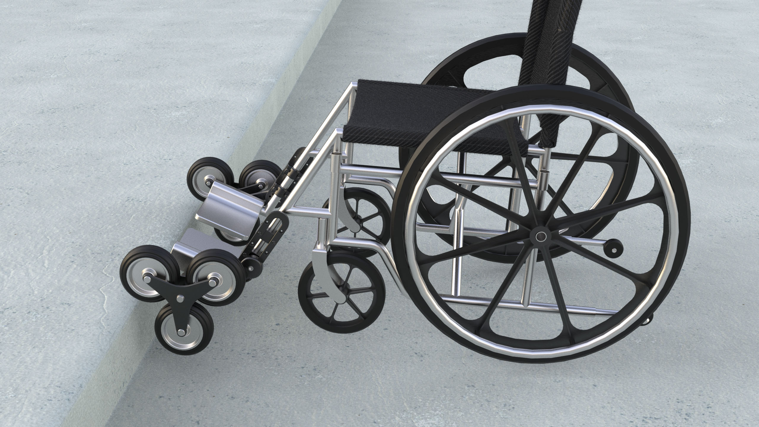 Here is how the tri-wheels will be used to overcome a barrier obstructing a wheelchair user. This product will need to be used along with anti-tipping devices already installed on the back of the wheelchair.