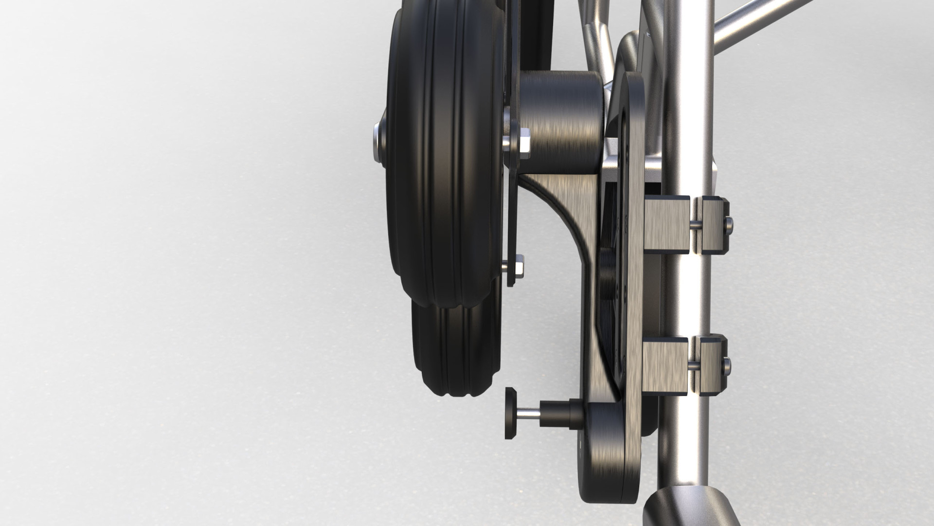 The device has a spring bolt that locks the wheels in position when mounting over barriers or when holding the wheels off the ground at rest. By simply pulling the handle the bolt can be retracted and allow the user to re-position the wheels and then release the handle to lock it in that position.