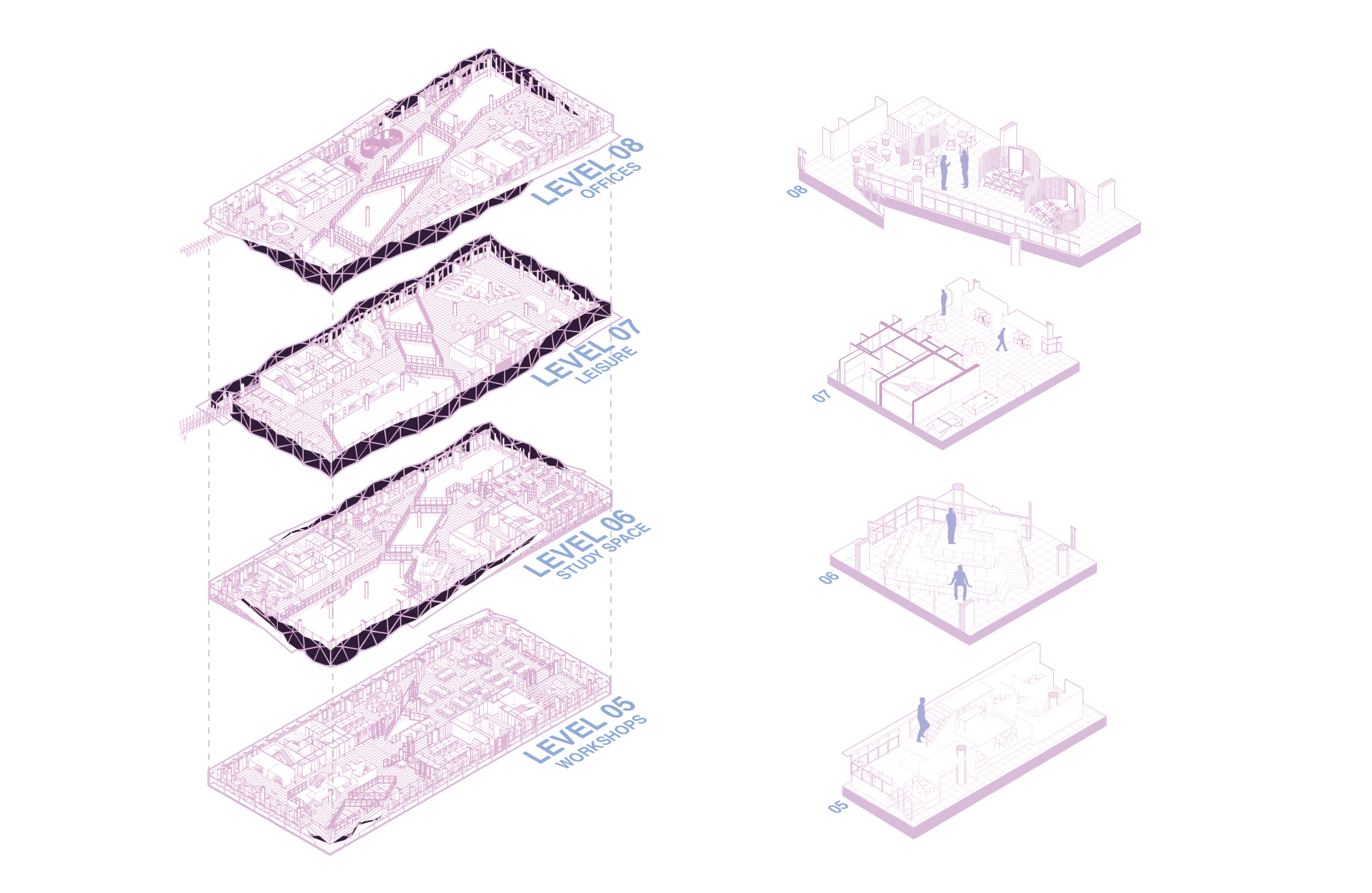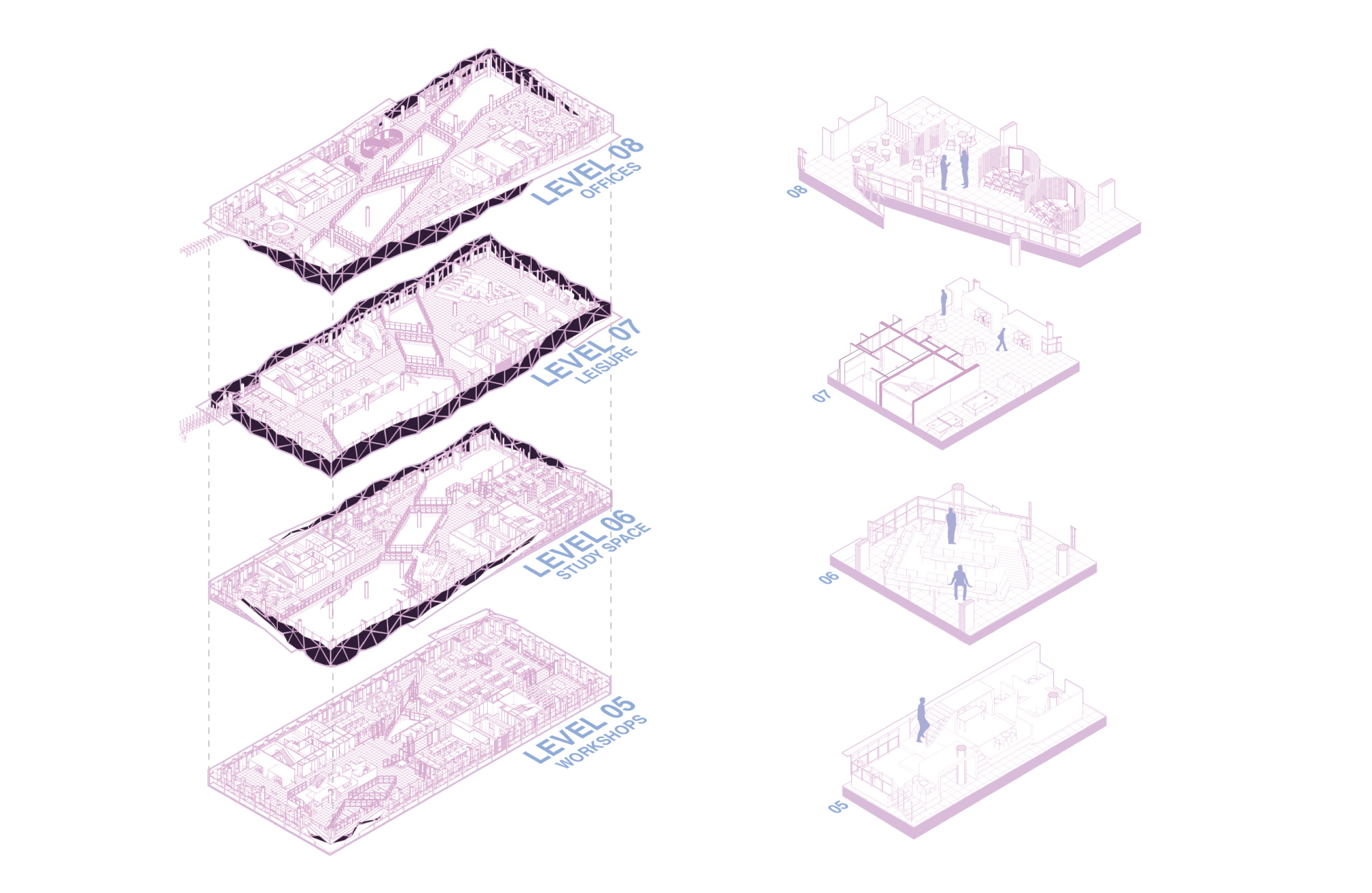 Allocating different programs to levels 5,6,7 & 8 while having large voids to improve porosity and connectivity within AMDC.