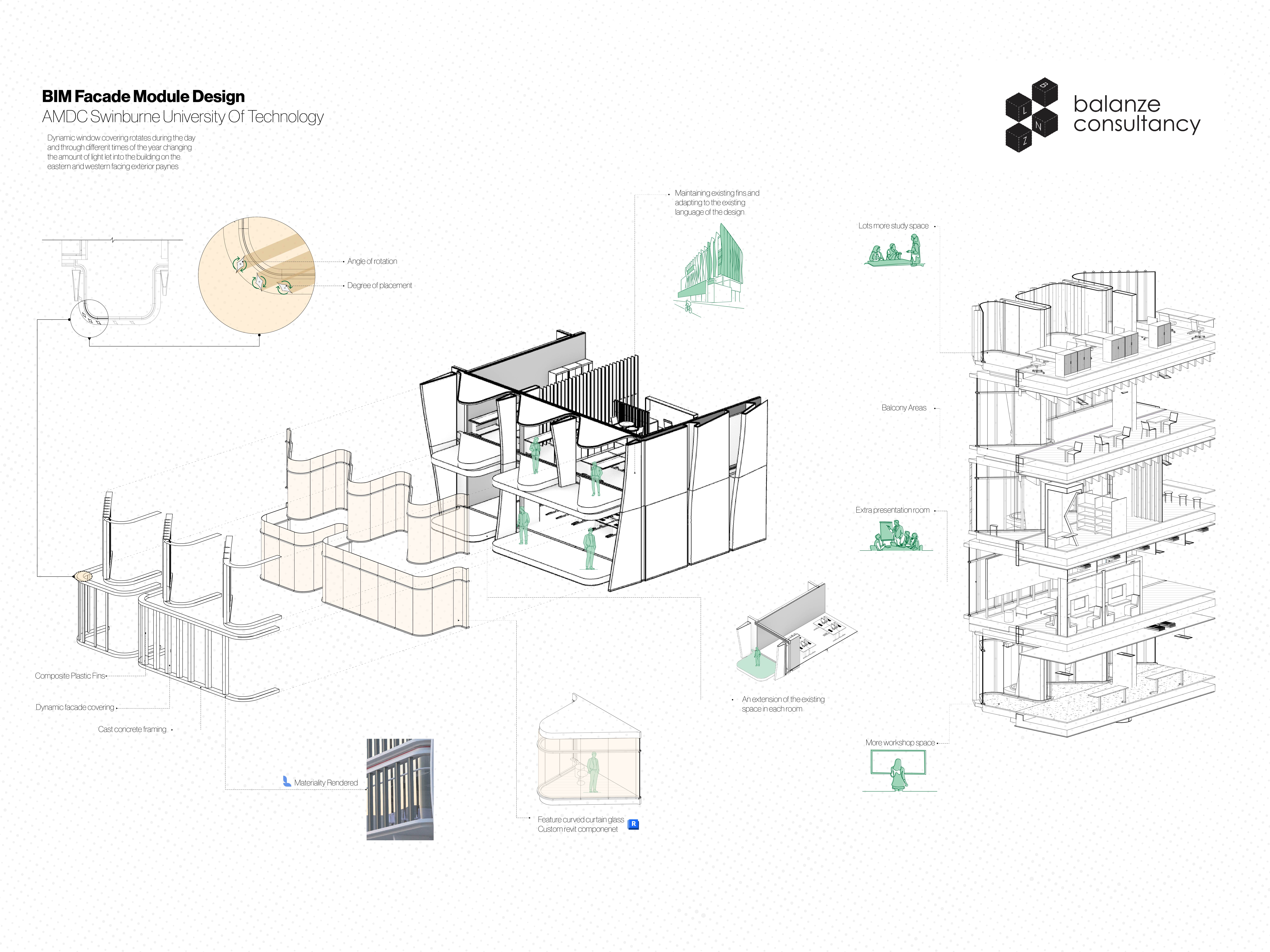 In my final semester I lead my BIM group in the external or facade design for the AMDC. Above is an exploded axonometric depicting the buildup of the facade modules and how they extend the existing space and program of the existing floors while maintaining the iconic current facade design.