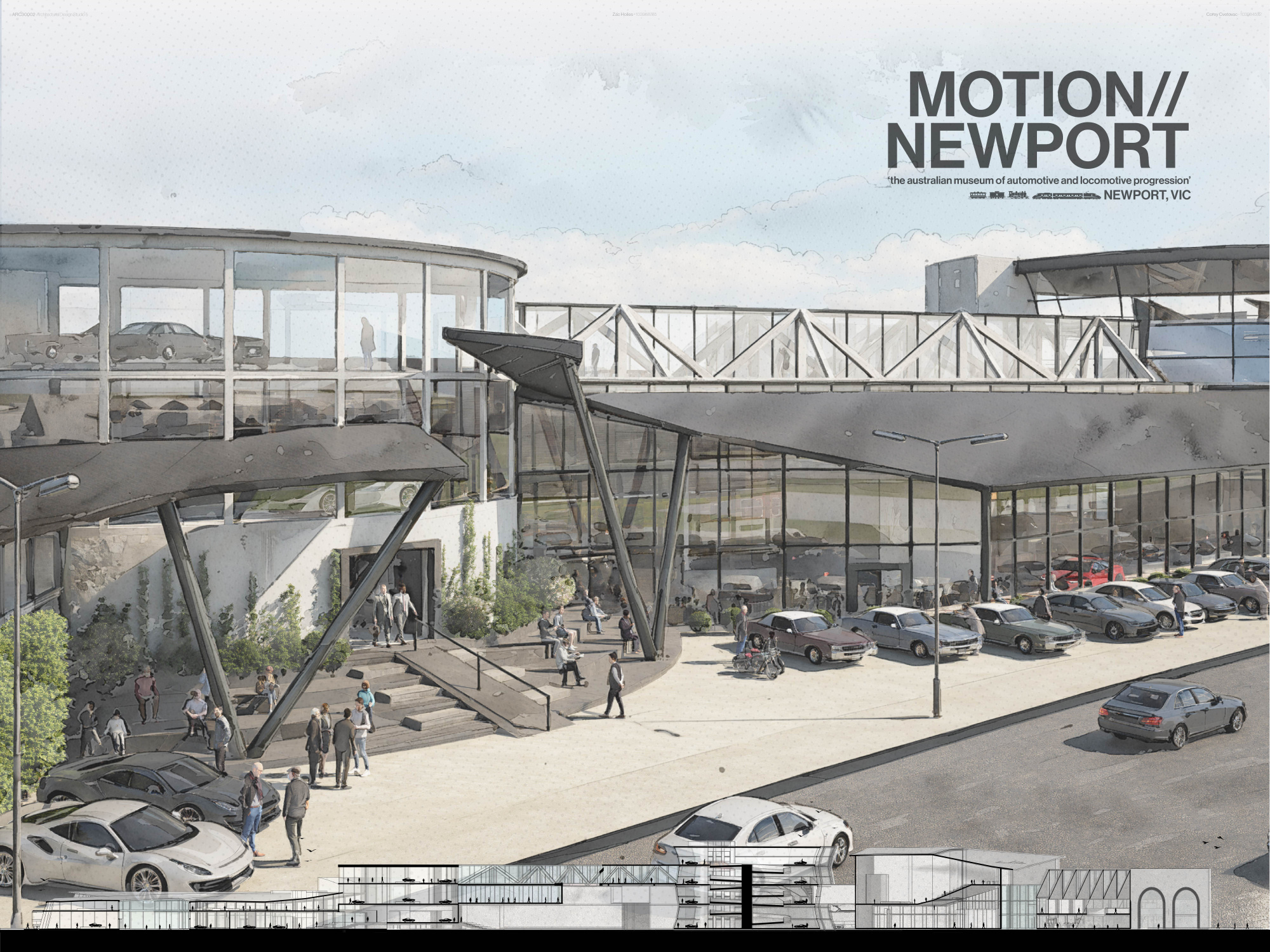 In Studio 5, my group partner Zac and I explored a concept that draws from both the site’s rich industrial heritage and our own personal interests. Motion//Newport celebrates the legacy of Australia’s automotive and locomotive industries, while highlighting the contemporary forms of manufacturing that continue to evolve today. The project responds to a brief asking to create an 'x' in the suburb of Newport as a way of inviting people in . We envision a space where production, exhibition, and public engagement intersect—creating an accessible environment that connects community and craft.