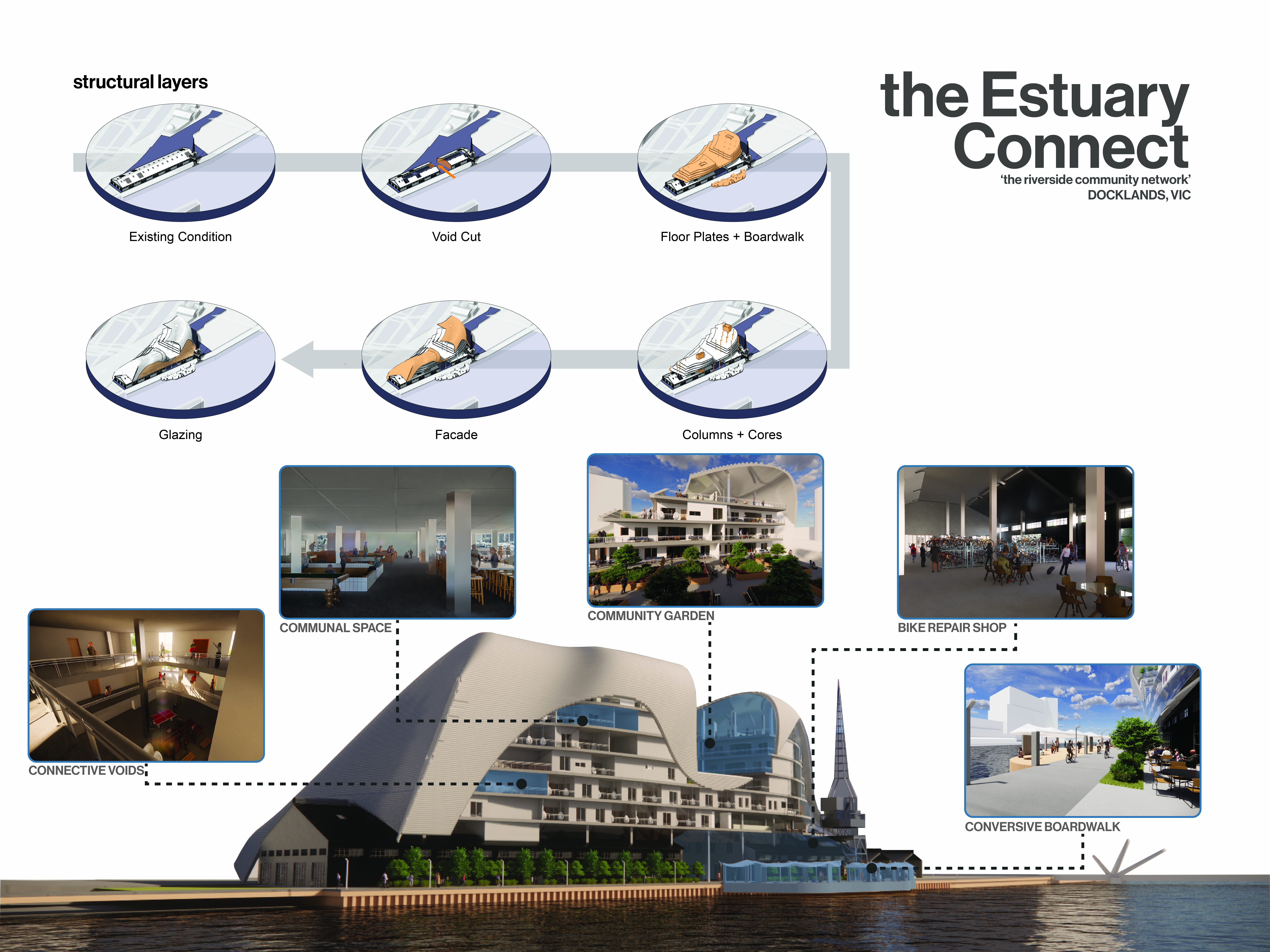 Key moments showcase our group’s design for The Estuary Connect, a mixed-use waterfront development along Flinders Street in Docklands. The project’s organic form, derived from earlier form-finding explorations, was adapted to suit the site while preserving elements of the heritage boatshed below. Considerations of structure, column placement, and service cores were integral to our design process and are expressed in the accompanying parti diagram, highlighting the project’s balance between form, function, and context.