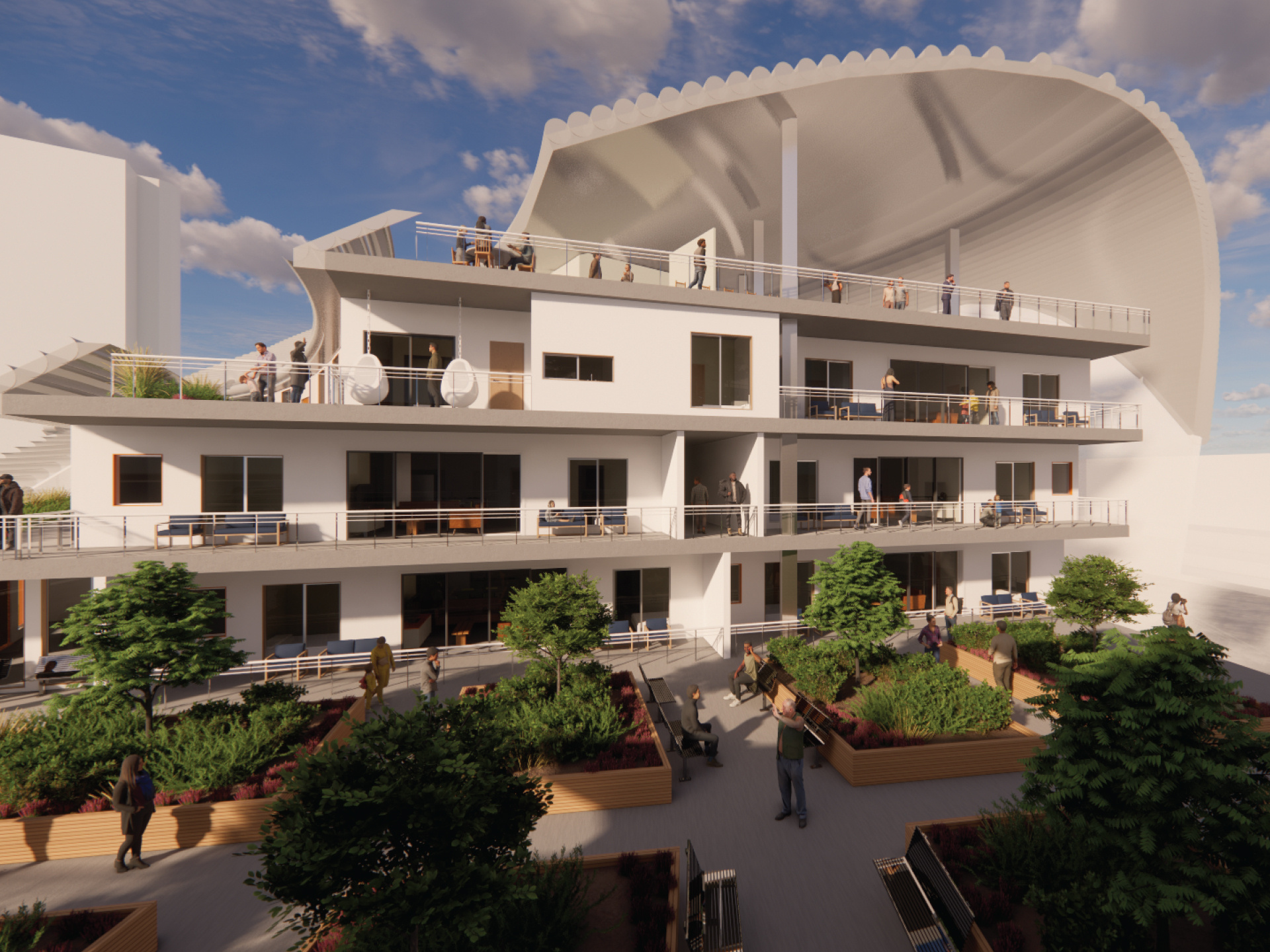 La Fede was developed for the Beyond Isolation senior housing competition, to address the growing issue of senior isolation. The brief called for 50 sustainable housing solutions that promote senior re-engagement within the community. La Fede was founded on the principle of finding value in what may seem overlooked, symbolised by a scrunched piece of paper that, once opened, still serves a purpose. Its materiality and façade reflect the strength and stability seniors bring to families and communities. The program emphasises communal integration while maintaining privacy and security, featuring restaurants and cafés beneath the apartments that border a local market, with rooftop gardens both public and private, providing spaces for connection and retreat.