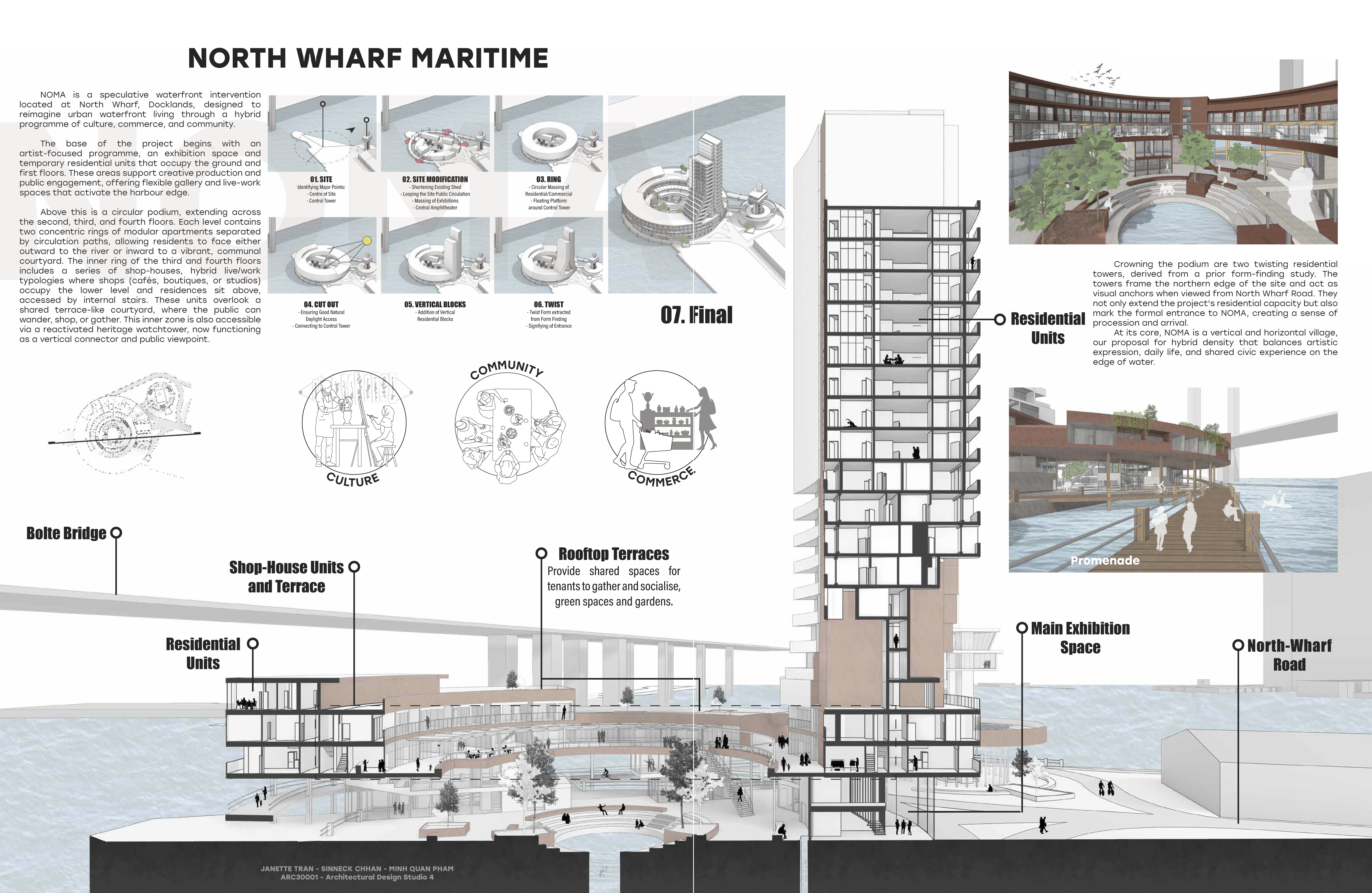 NOMA, located at North Wharf, Docklands, reimagines the urban waterfront through a hybrid programme of culture, commerce, and community. The design integrates artist-focused programmes, temporary residential units and public exhibition areas that activate the harbour edge.