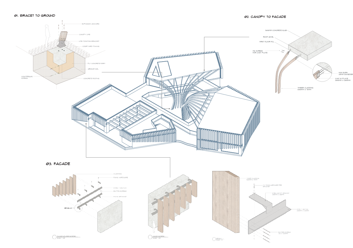Delving beyond just form, the construction detail of ‘Unified Haven’ expresses how structures and material expression reinforce the idea of social intent and special porosity. This axonometric exposes the detailed construction systems that bind key elements, turning the project into a unified whole.