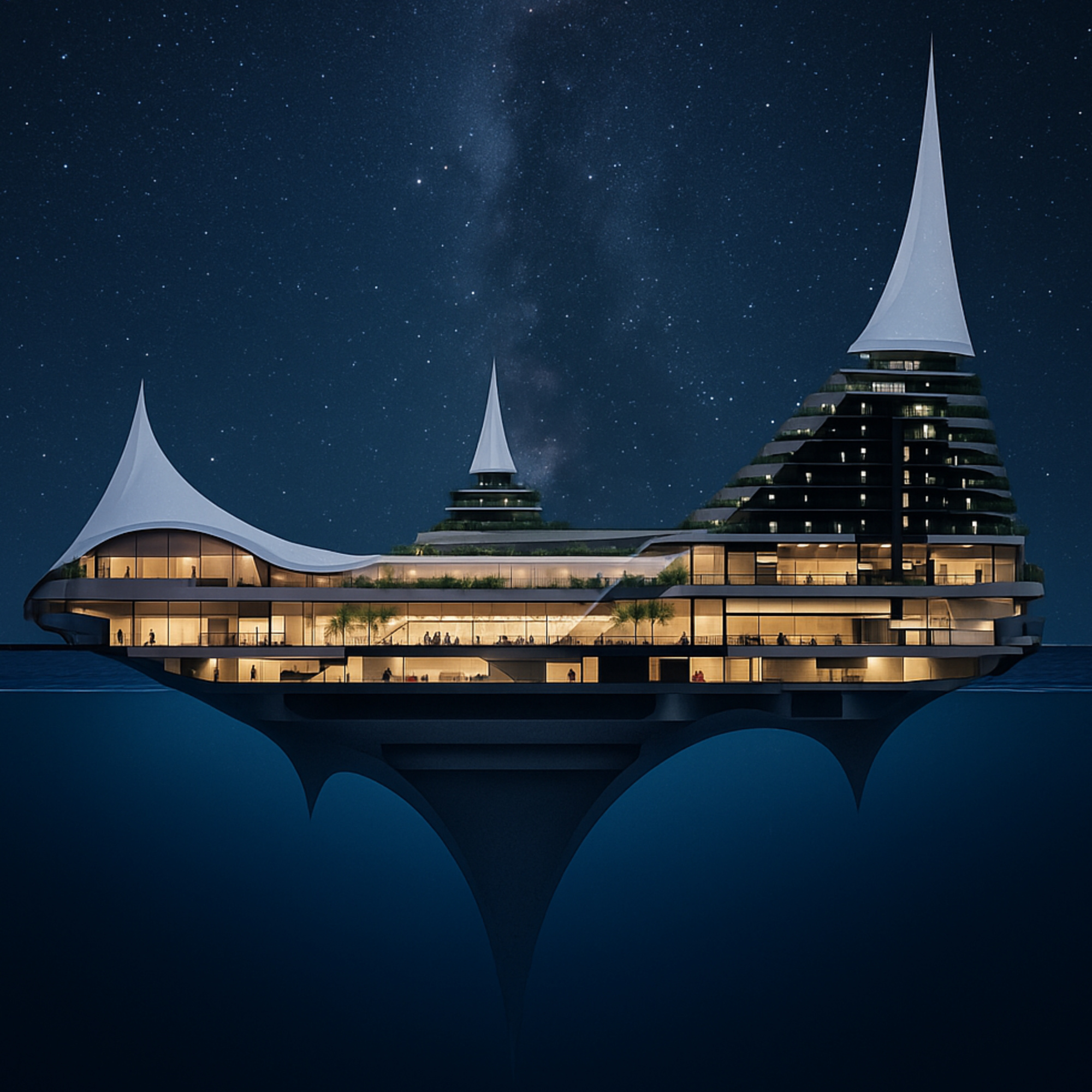 Named after the Latin phrase “from the bottom of the river to the stars,” the building descends 23 metres below sea level and rises toward the sky. Each level frames a different layer of the landscape: underwater, city edge, and open sky, creating a curated sequence of environmental experiences.