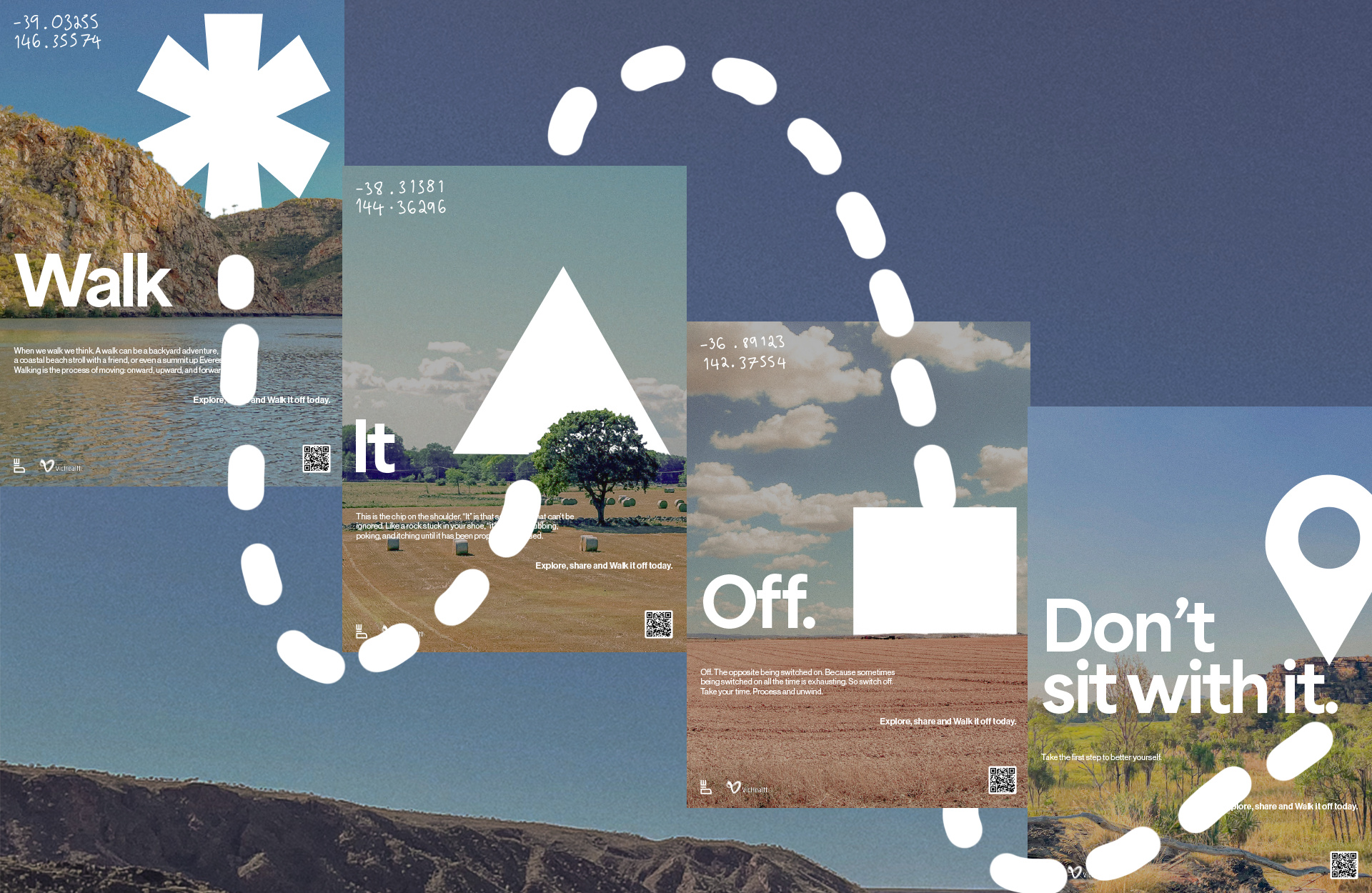 As part of a design-informed research project, "Walk It Off" is a brand identity for a program that promotes immersion in nature through hiking as a way to support better mental health. This personal passion project was initially sparked by the importance of men’s mental health and the lack of comfortable spaces for men to open up and come out of their shells, particularly if they feel trapped in routine and their everyday environments.