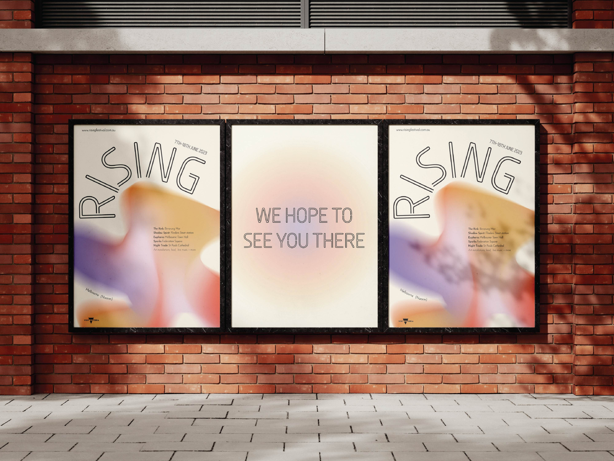 This project reimagined the Rising Festival with a more vibrant, colourful visual identity. It was centred around a gradient created in Illustrator, which was applied consistently across the poster, guidebook, and website. The guidebook provided festival details, event listings, a map, and accessibility information, creating a cohesive and engaging festival experience.
