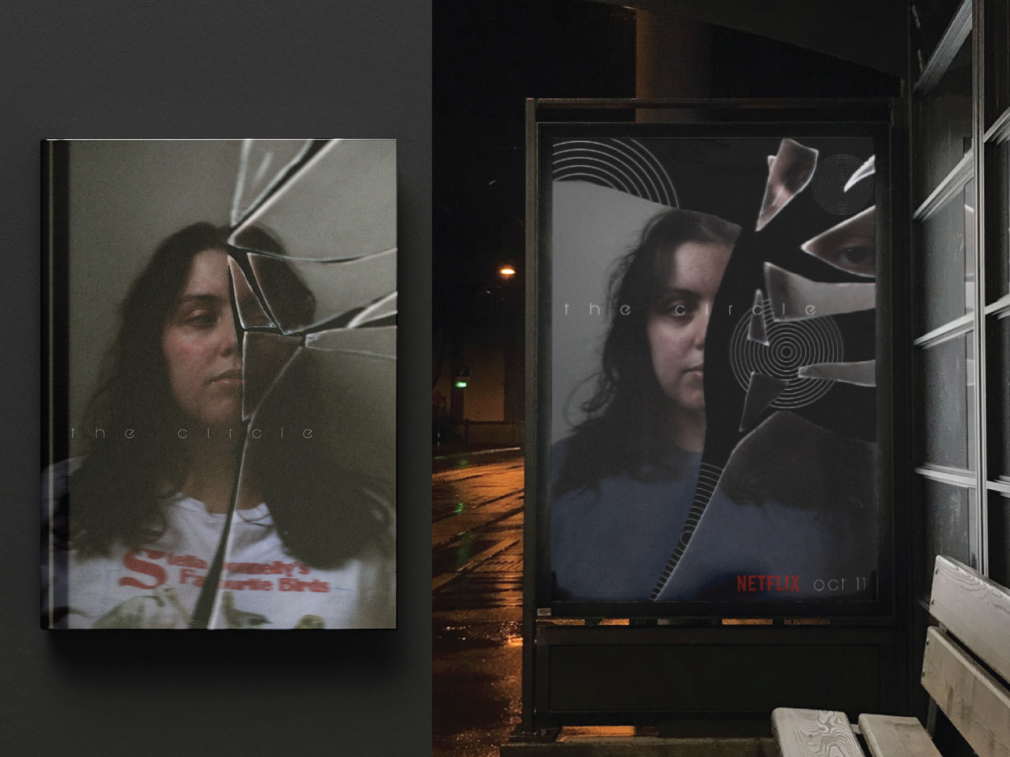 This project required a rebranding of the novel, The Circle, by Dave Eggers. Three concept images were created using Photoshop techniques, including layer masks, filters and effects, to merge visuals and convey the protagonist’s loss of identity. The final artworks were applied across commercial contexts, including a reimagined book cover as well as poster and billboard designs for a Netflix adaptation.