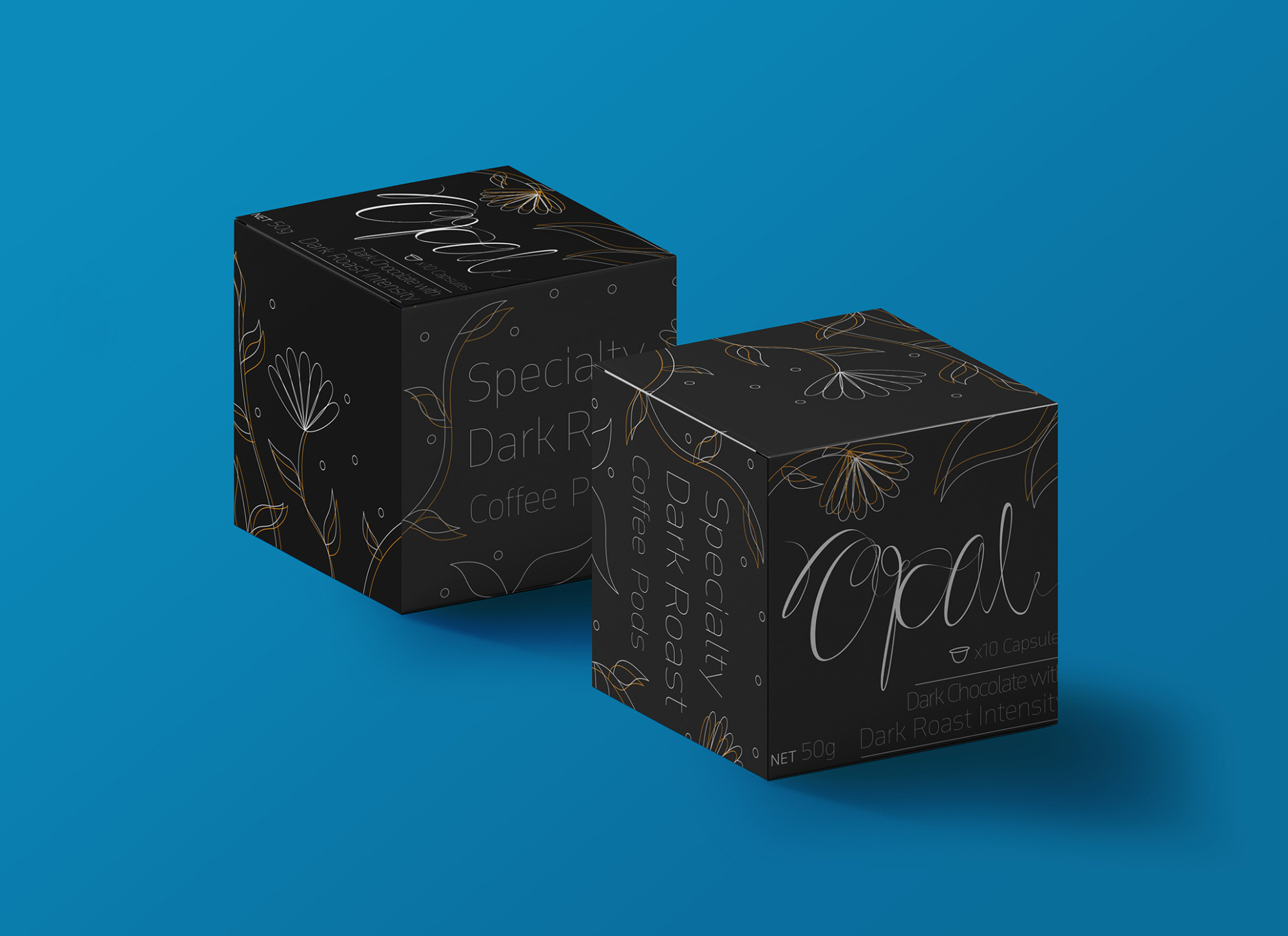 Opal is a coffee brand that specialises in flavoured coffee pods. For this project a flowery style was chosen to convey a relaxed and tranquil feeling while holding a bit of edge to it. The gold and brown palette push the idea of this luxury coffee brand further, along with its cursive styles.