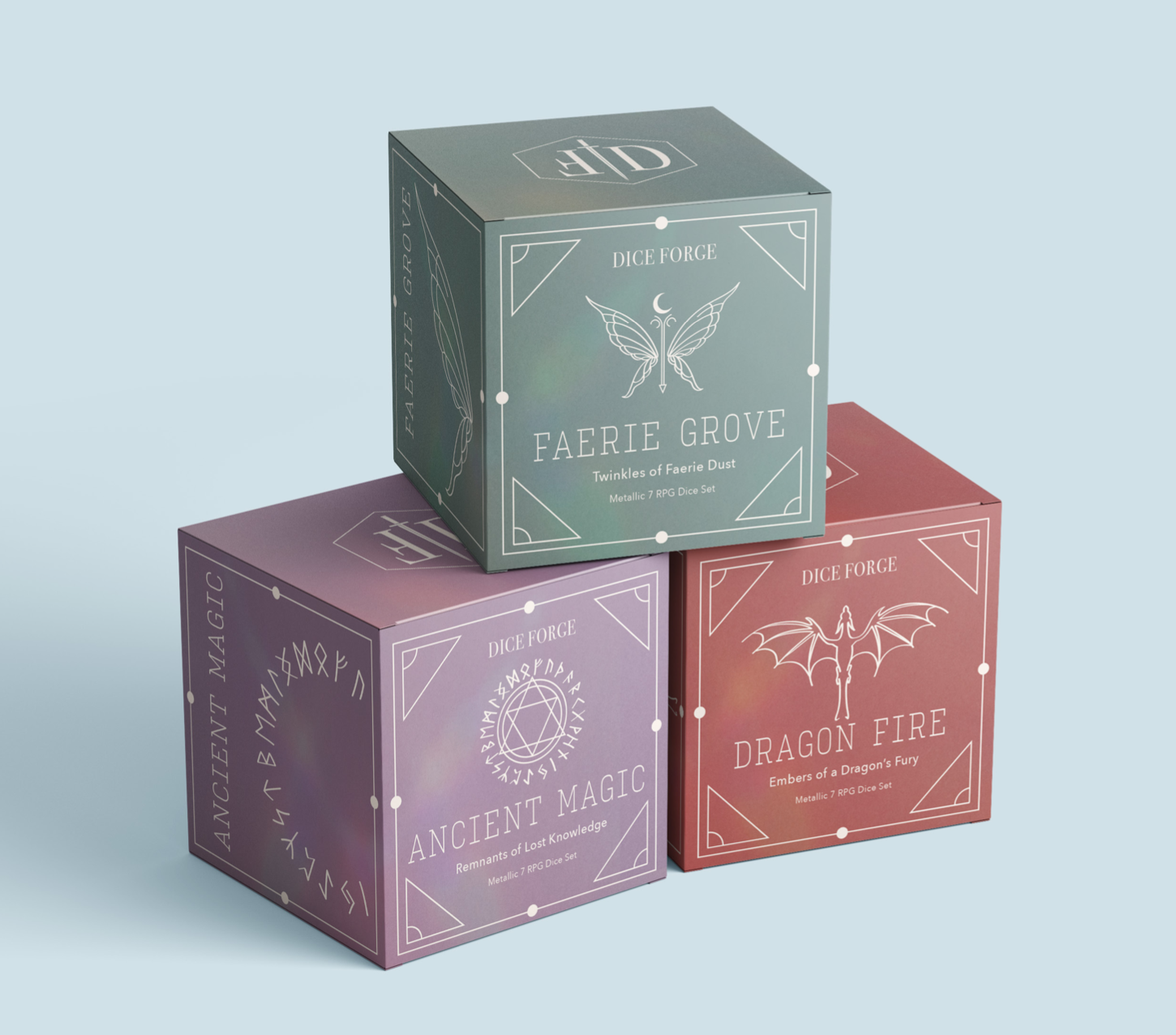 This project involved designing a cohesive trio of packaging for themed D&D dice sets, each box featuring a distinct magical schematic while maintaining a unified visual identity through consistent typography, layout, and ethereal colour palettes.