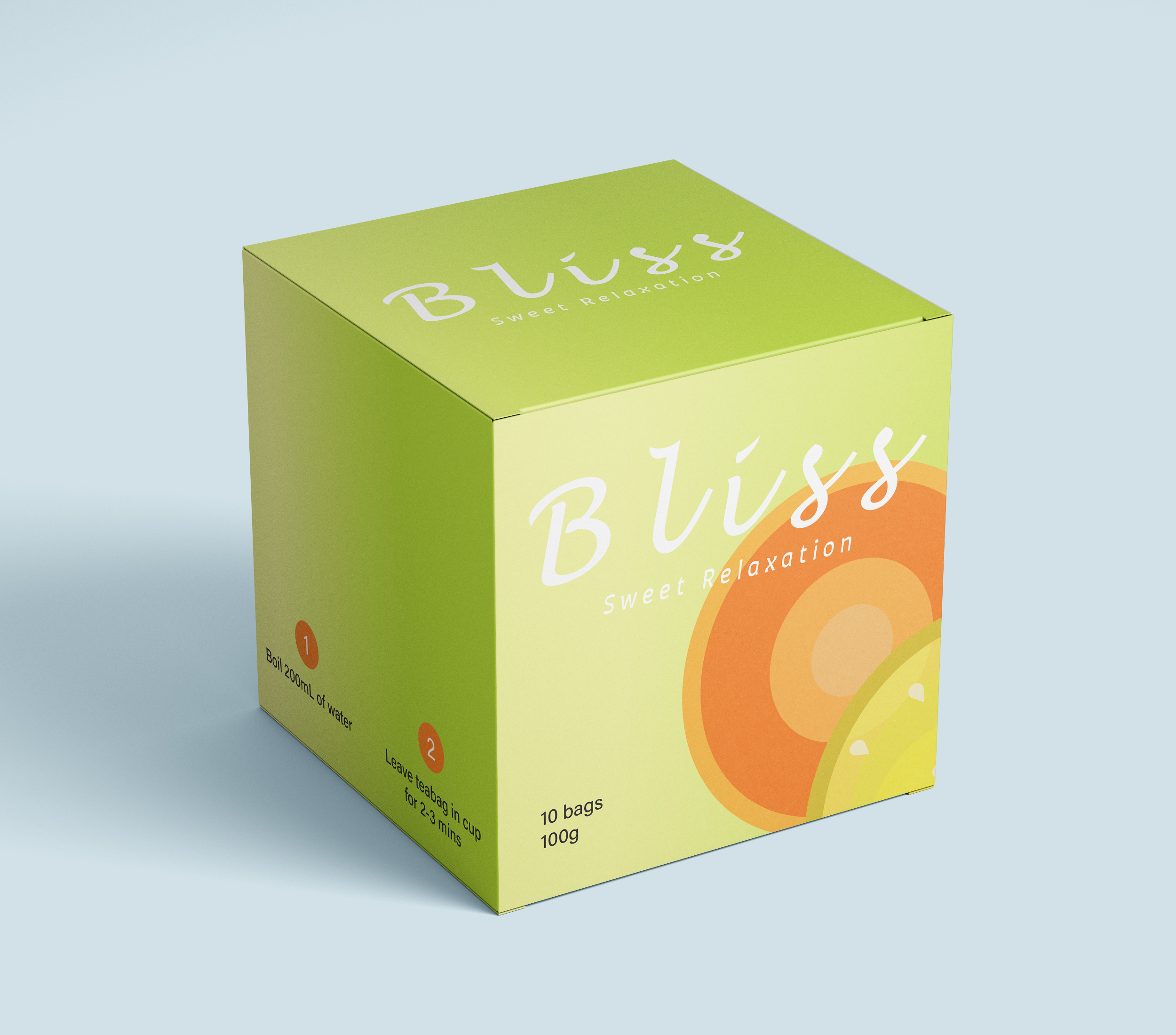 Bliss has a range of tea boxes, with bright and inviting imagery. The design clearly communicates the flavour of each tea box and presents itself as a sophisticated brand.