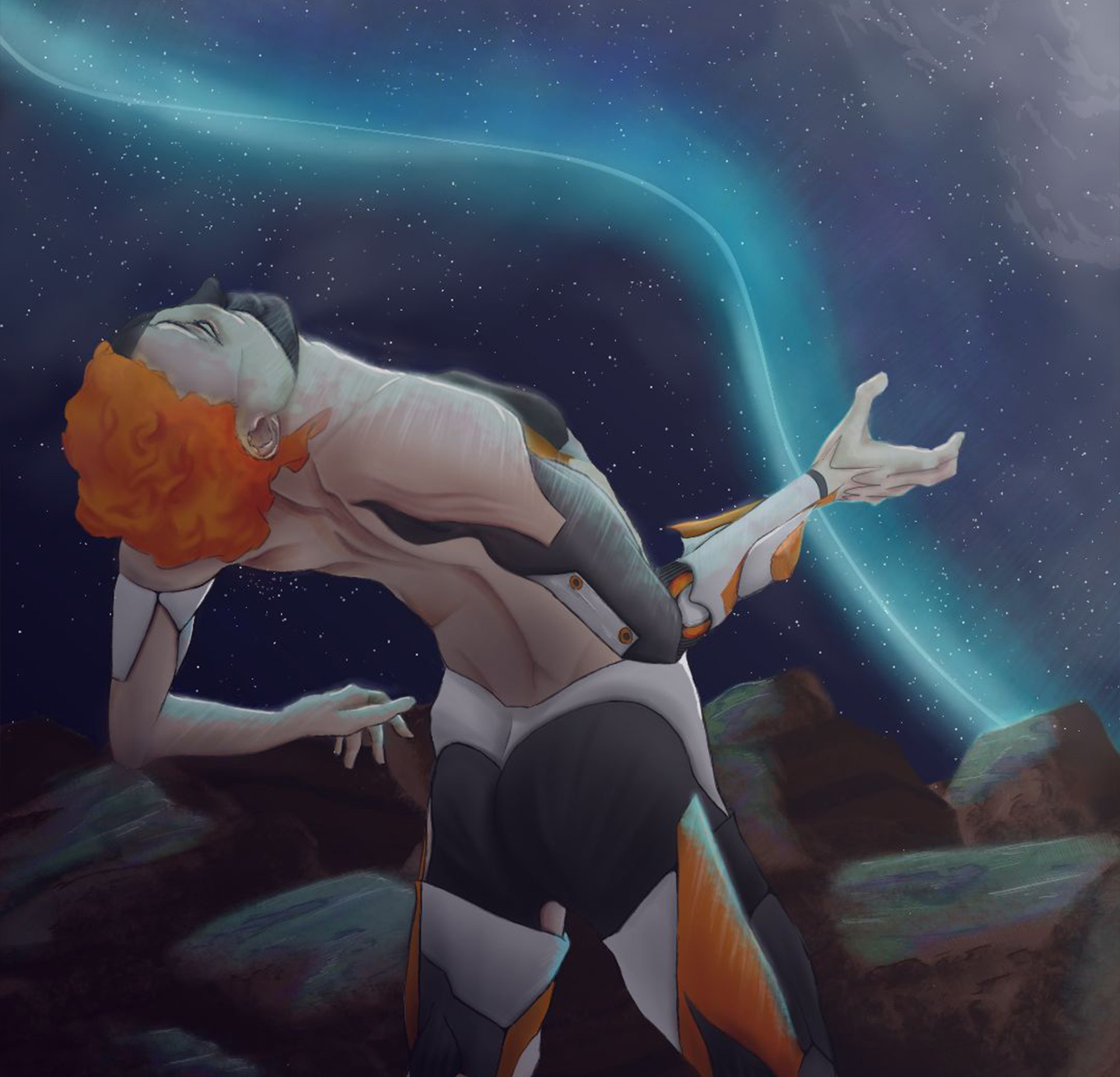 This character is a part of a book I have been writing called To Our Eternity. The image invites audiences to peer into Freddie’s soul through a dynamic pose that conveys his inner pain. The dark lighting enhances his sense of mystery and internal suffering, while the aurora, a streak of light, symbolises the goodness that still lies within him.