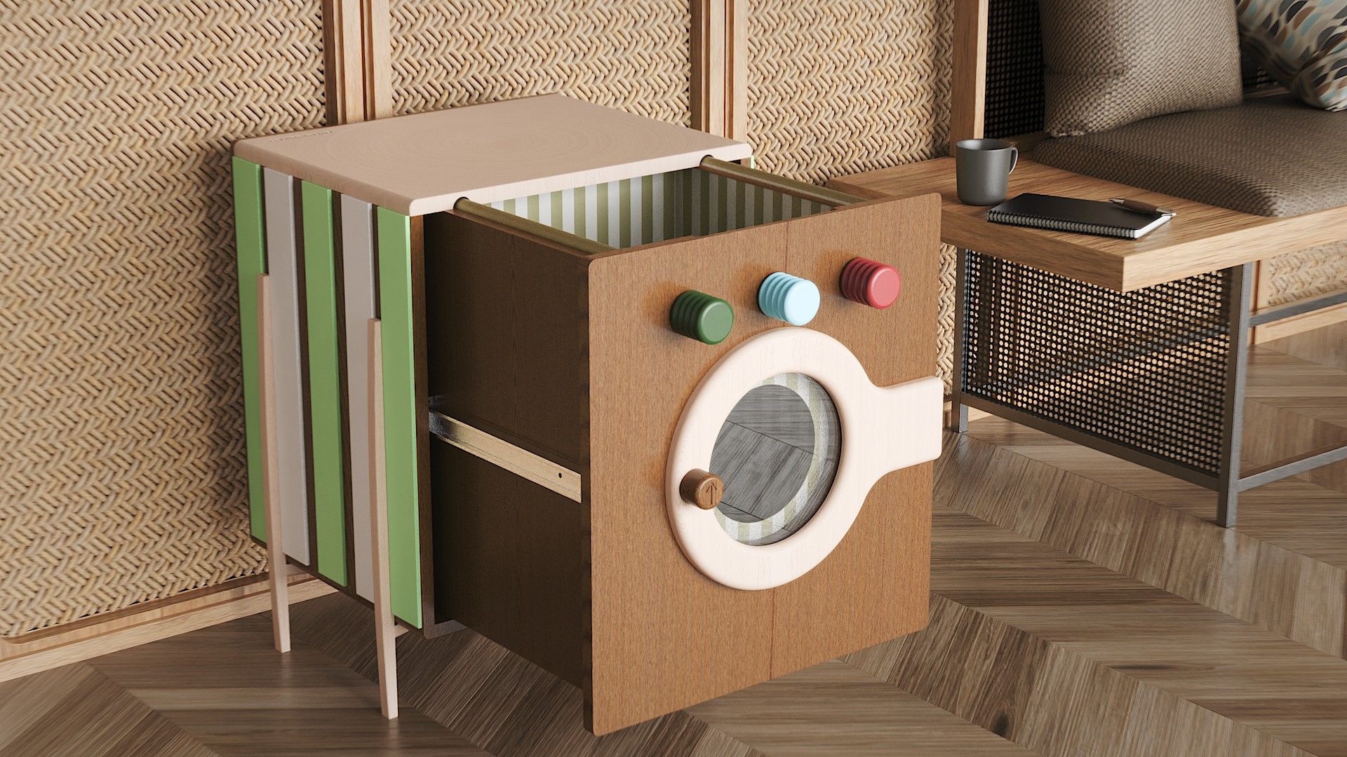 Designed in partnership with Country Road, this laundry hamper was constructed to mimic the action of putting clothes into a washing machine, featuring a playful front hatch that children can interact with. Manufactured through CNC machinery, this easy-to-assemble product can integrate into any home, offering a cute solution to an often mundane task.