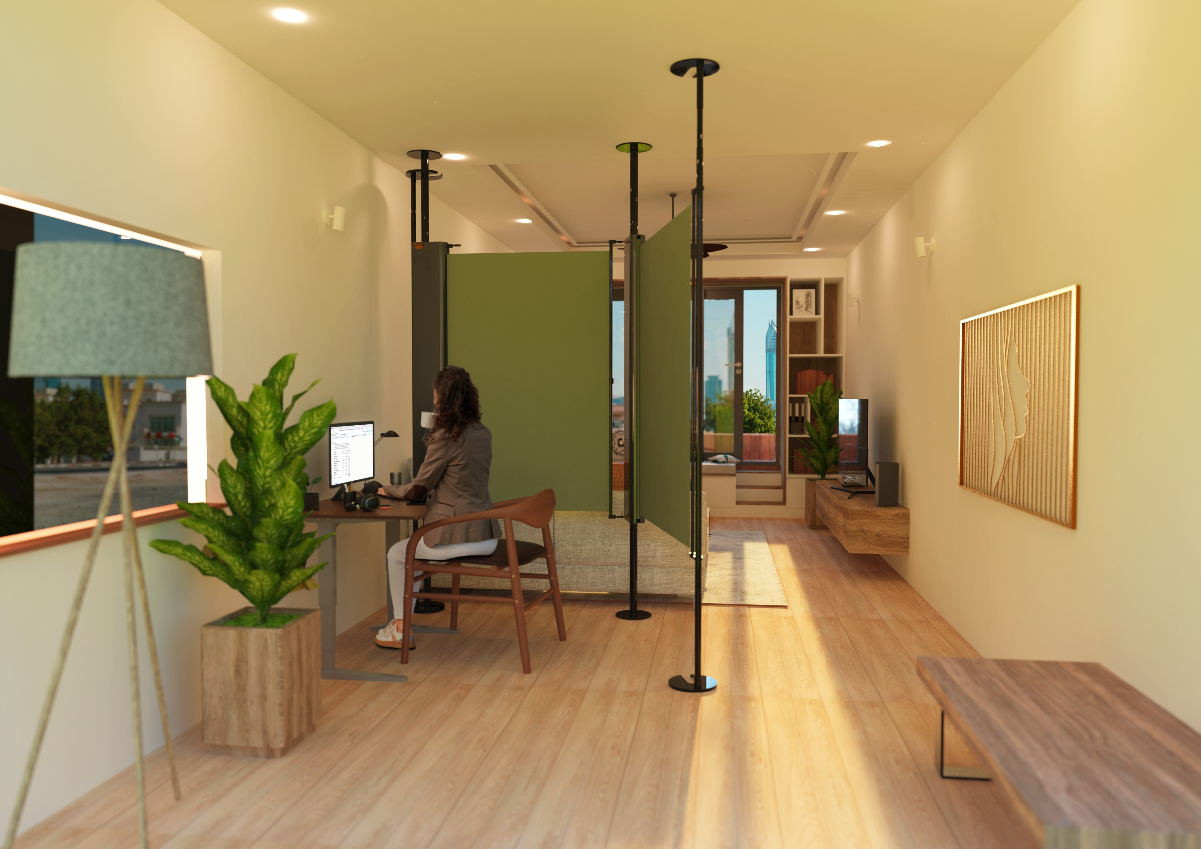 A product designed to offer greater privacy within our homes, as a rapidly changing world now sees our dwellings becoming shared spaces where multiple tasks overlap. This pull-out screen is housed within a sleek aluminum body and supported by tension poles, offering a renter-friendly solution to a seemingly common issue in our modern world.