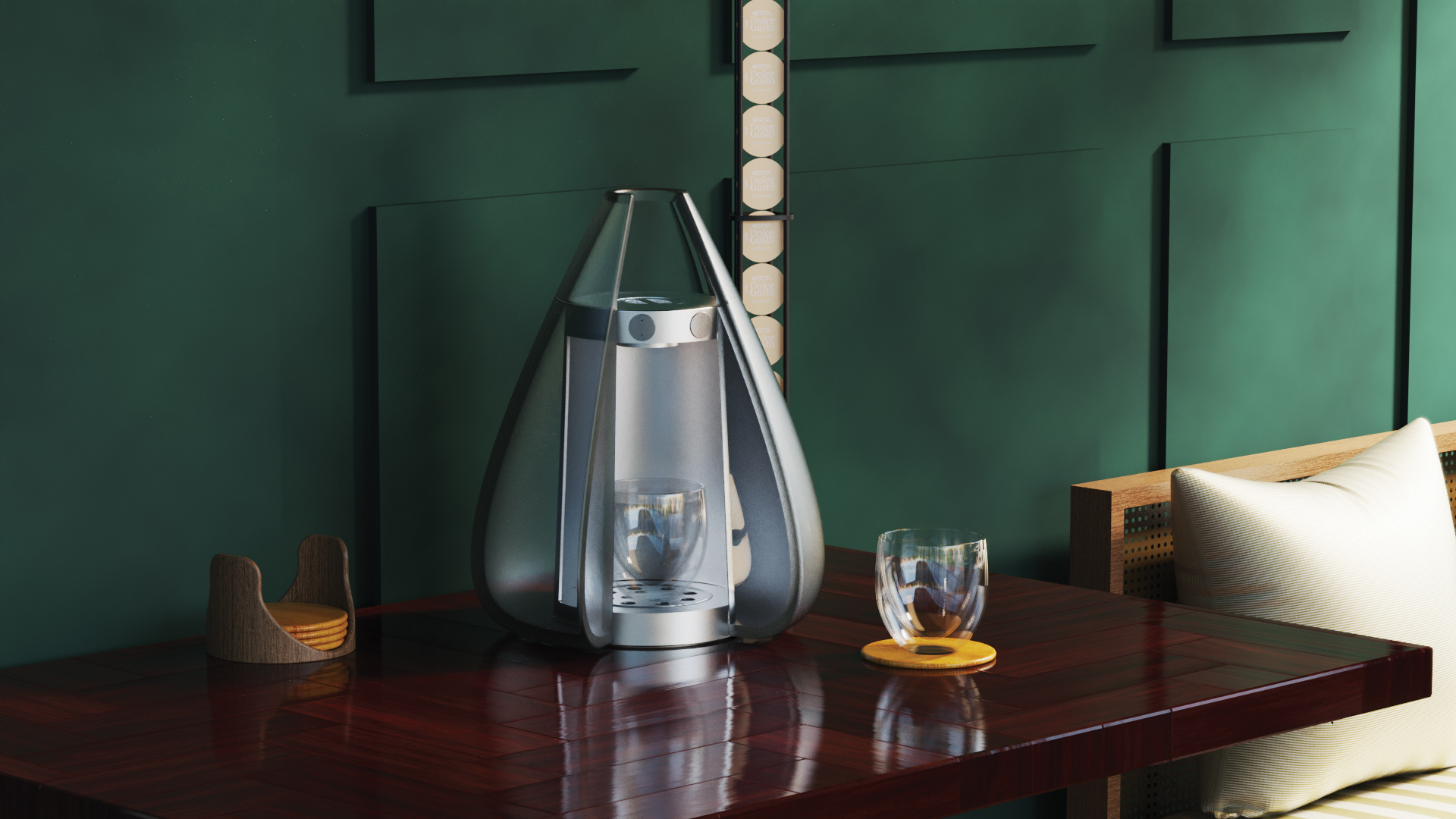 Inspired by the simplicity of a single drop of water, the Droplet Coffee Machine reimagines the everyday ritual of brewing coffee. Its sculptural water tank takes the form of a water droplet, with the interior body being a simple cylinder form, making it easy and inviting to use. Designed with precision and elegance, it combines modern materials and intuitive functionality to create a refined brewing experience that looks as good as the coffee tastes.