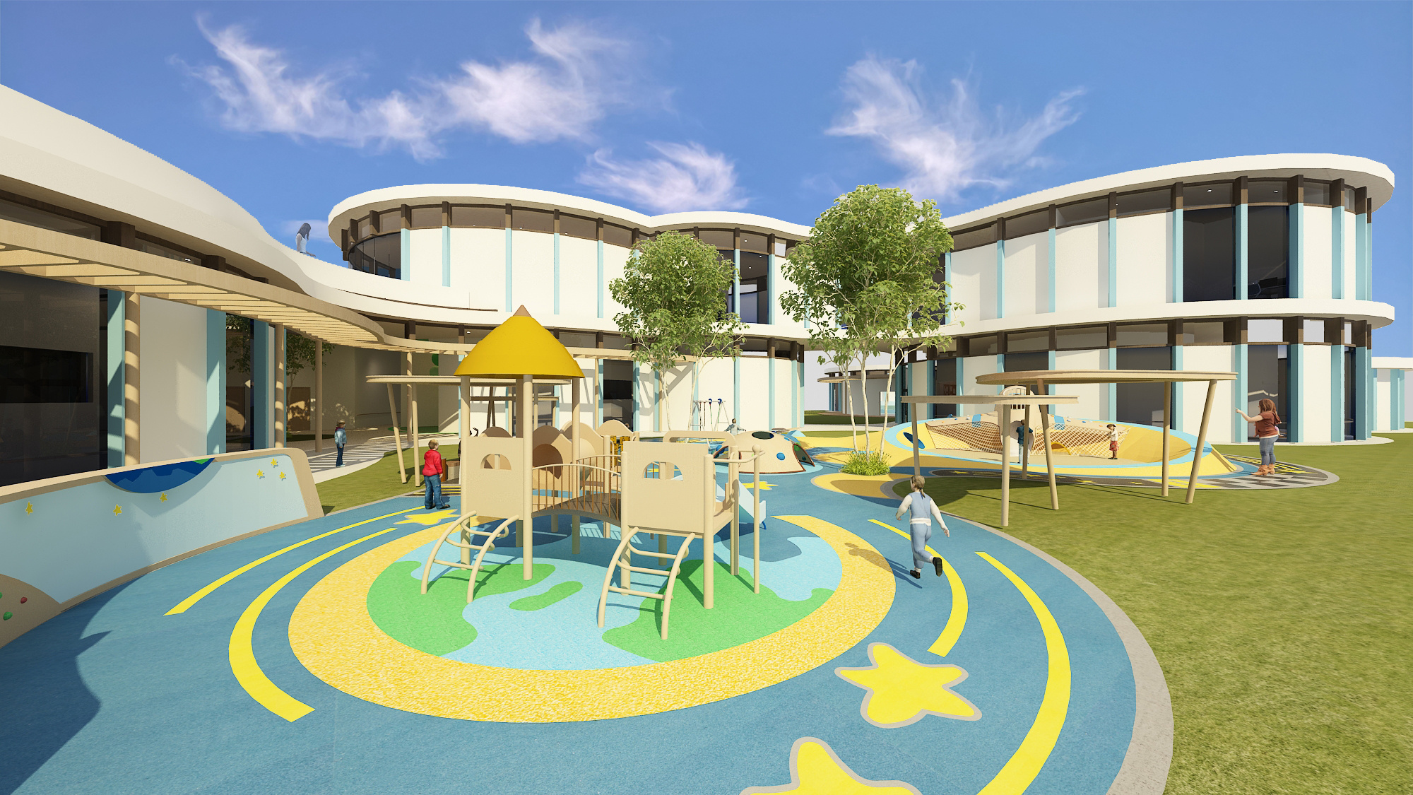 Students are challenged by different equipment such as the climbing hills at the center, the tactile wall and sensory wall where there is different material and texture to stimulate the children through touch, colour and sound.