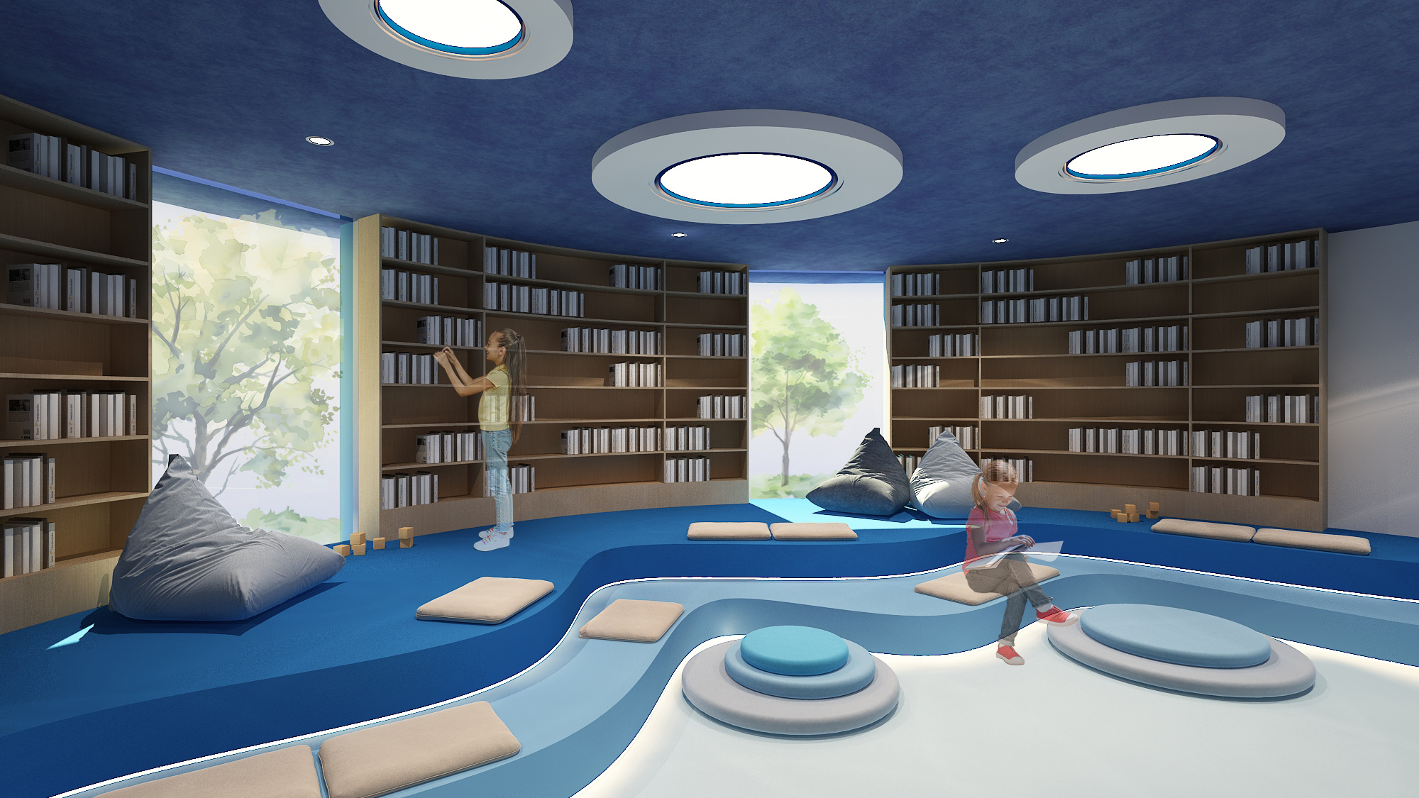The sensory quiet room accommodates both high and low-stimulus needs for the neurodiverse children with flexibility control, like adjustable lighting to avoid overstimulating, movable furniture like bean bags, and seating with soft materials to absorb sound.