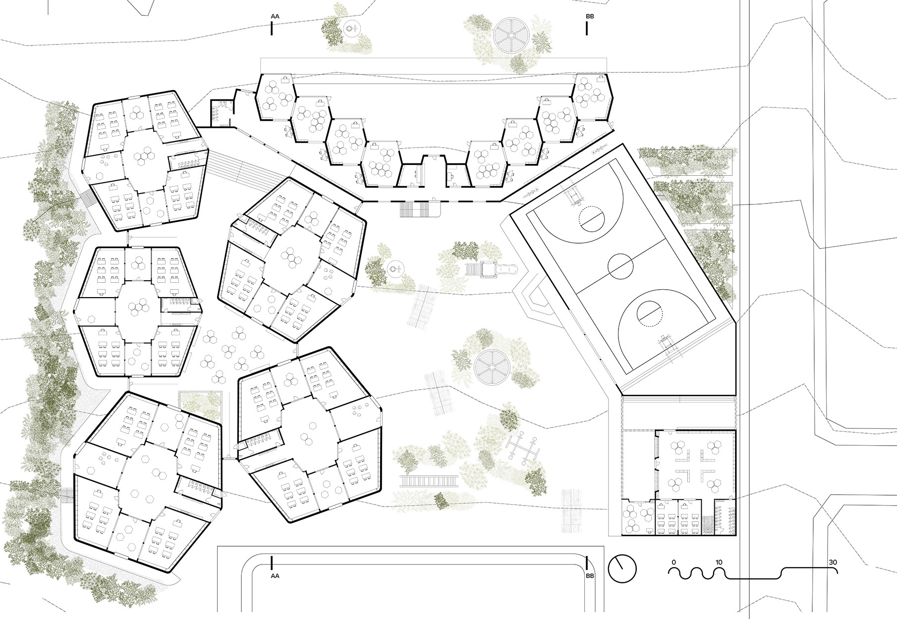 The existing language of the hexagon is fragmented and pulled apart to create fractured learning spaces, small meeting grounds to participate in spontaneous learning.