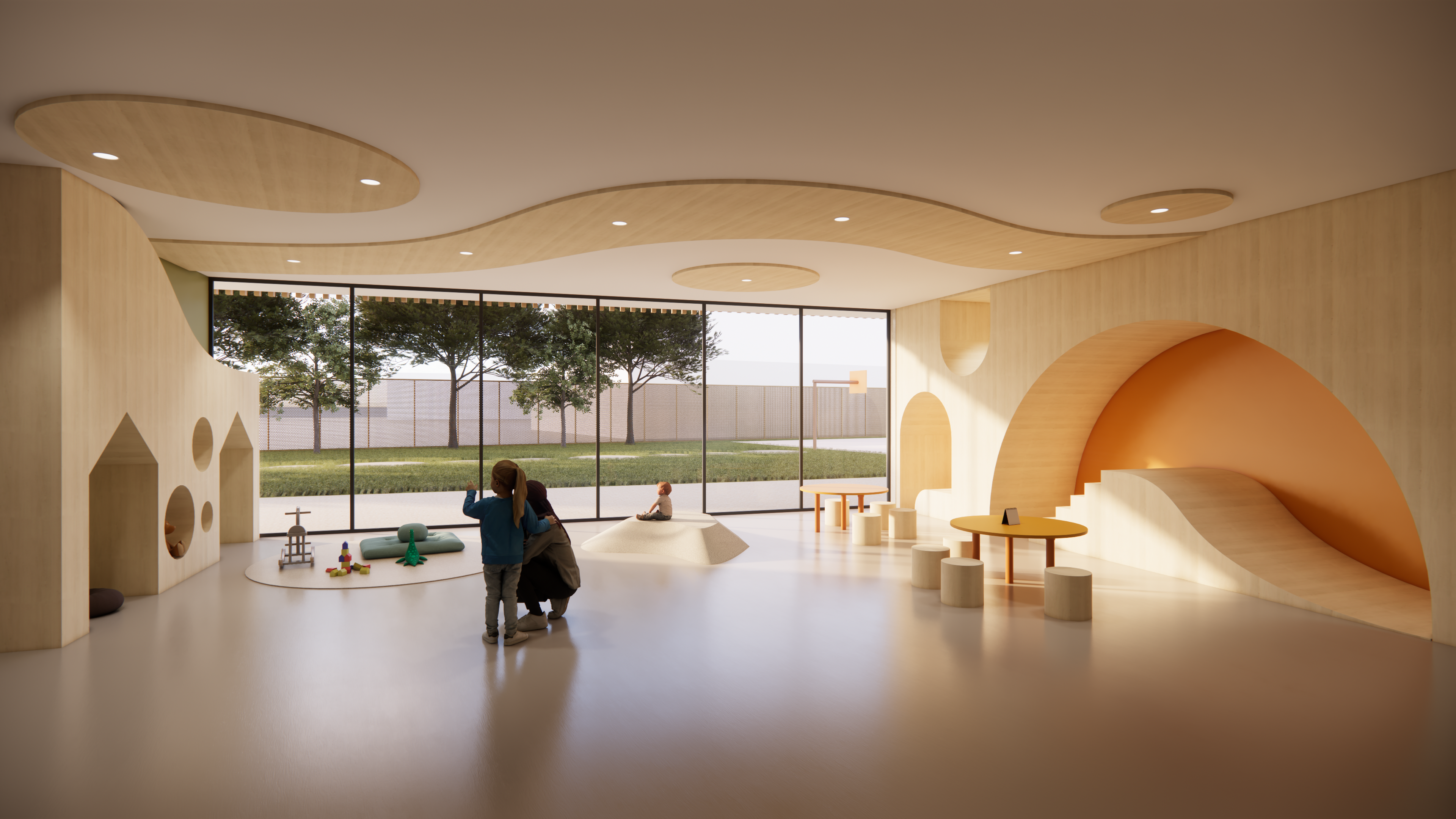 Designed to foster safety, comfort, and creativity. The bright orange wall inspires happiness and imaginative play, while soft, neutral timber elements provide warmth and balance. The layout encourages exploration and interaction, creating an environment that supports learning and emotional well-being. Also this allows mothers time