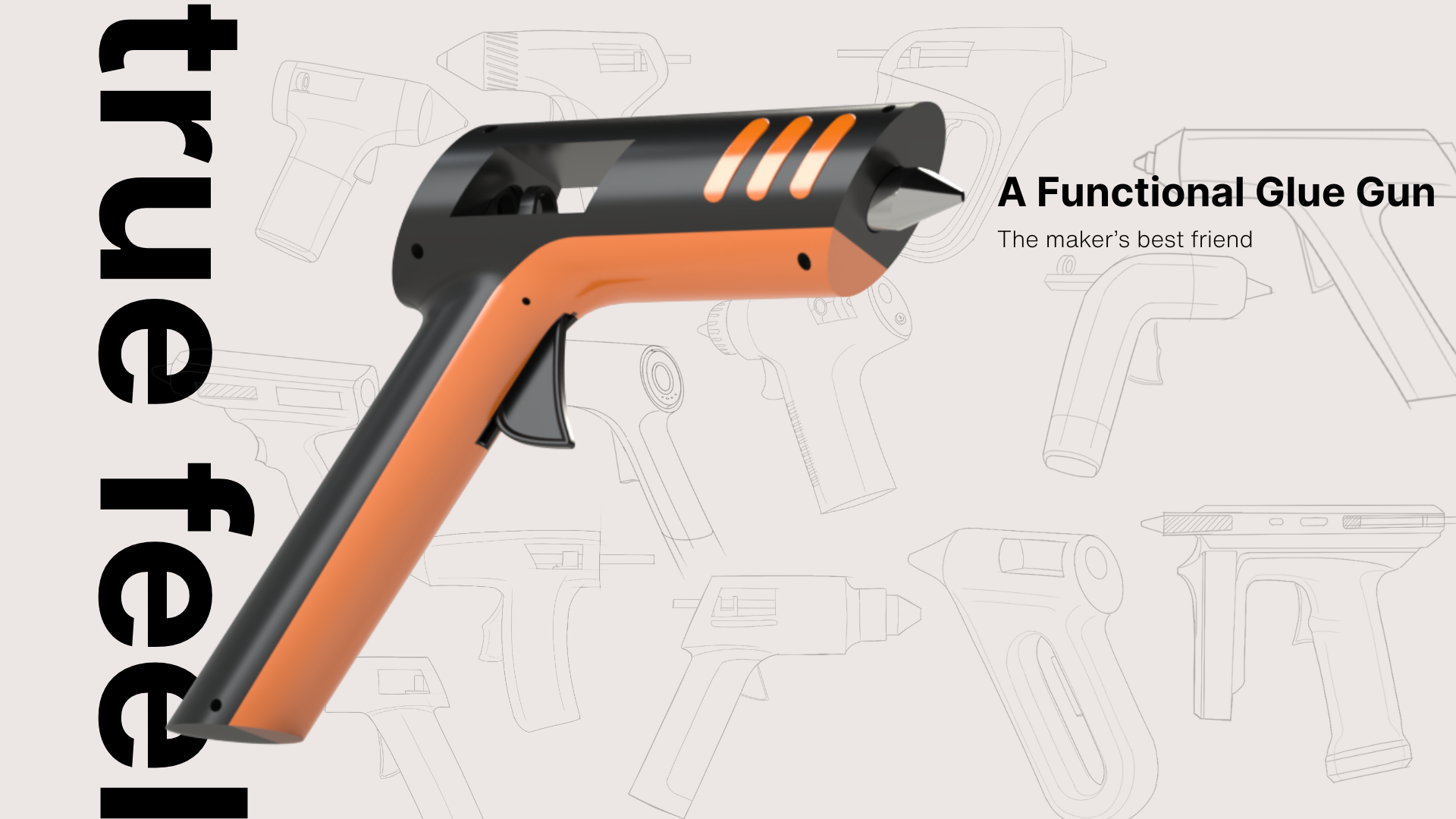 This project reimagines a glue gun for DIY users. True Feel is a durable, intuitive tool with balanced design, soft-grip comfort, and clear safety cues. The True Feel glue gun delivers a refined, user-centered design that balances ergonomic comfort, intuitive safety features, and sustainable material choices, tailored for experienced DIY users.