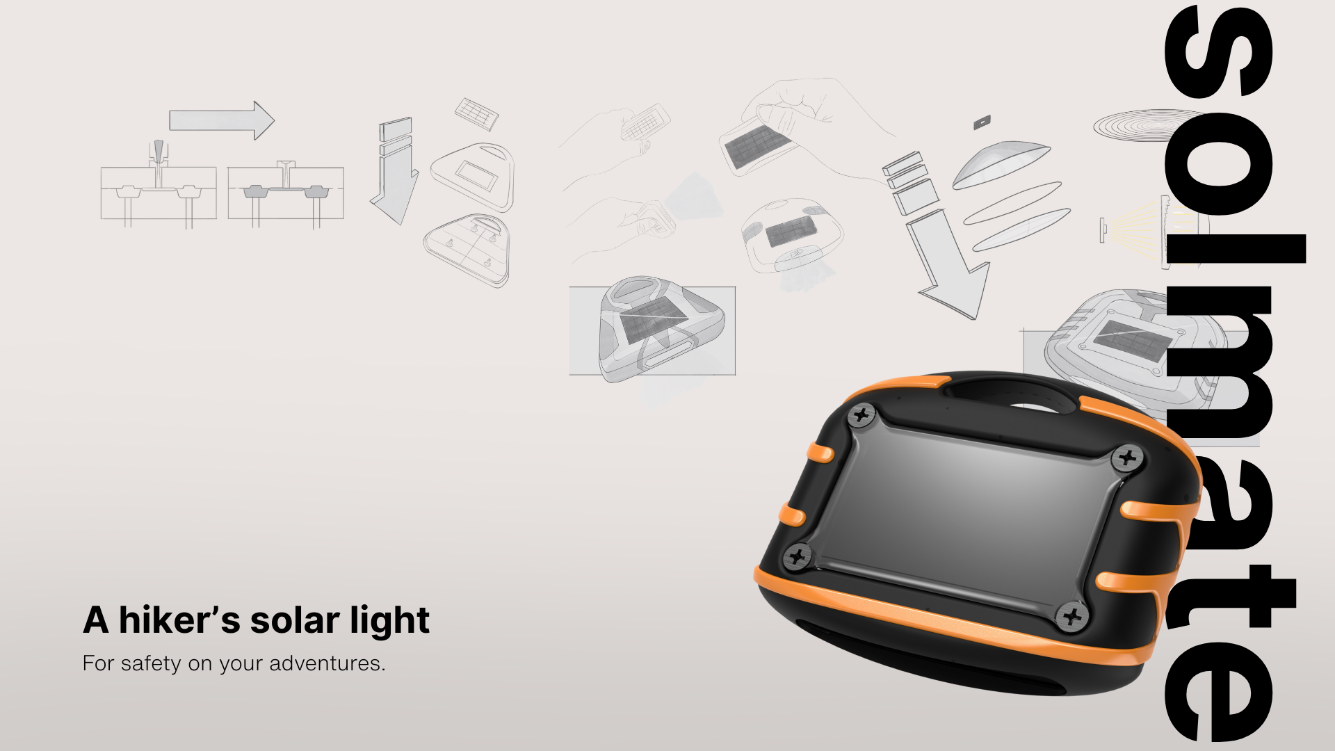 This project delivers a rugged, solar-powered outdoor light designed for camping and hiking. The product features a waterproof, impact-resistant housing with a polycarbonate shield, silicone over-moulded grip, and integrated carabiner cut-out for easy attachment. It uses a high-efficiency solar panel, LED optics with a reflective chamber for maximum brightness, and a rechargeable battery for sustainable energy use. Iterative prototyping refined durability, assembly, and usability, resulting in a compact, reliable lighting solution for outdoor enthusiasts.