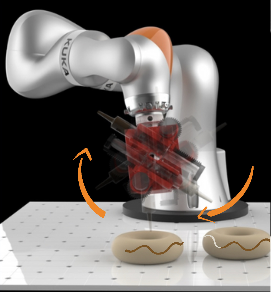 An end effector was designed for a KUKA robot to ice donuts with various designs, enabling fast and accurate production without failures over repeated operations.
