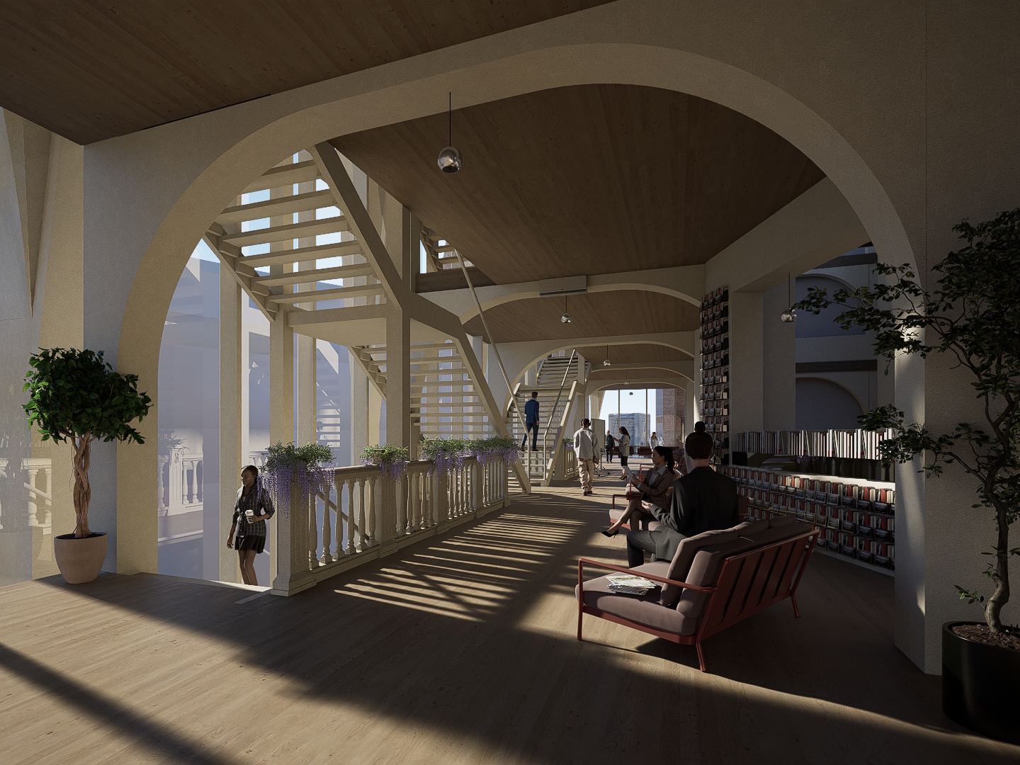 An interior render of AEON that showcases the integrated bookshelves situated next to the central light-well. This design ideology was used to allow for ease of public circulation, design porosity, as well as little moments that happen only through the gaps between the feature shelves.