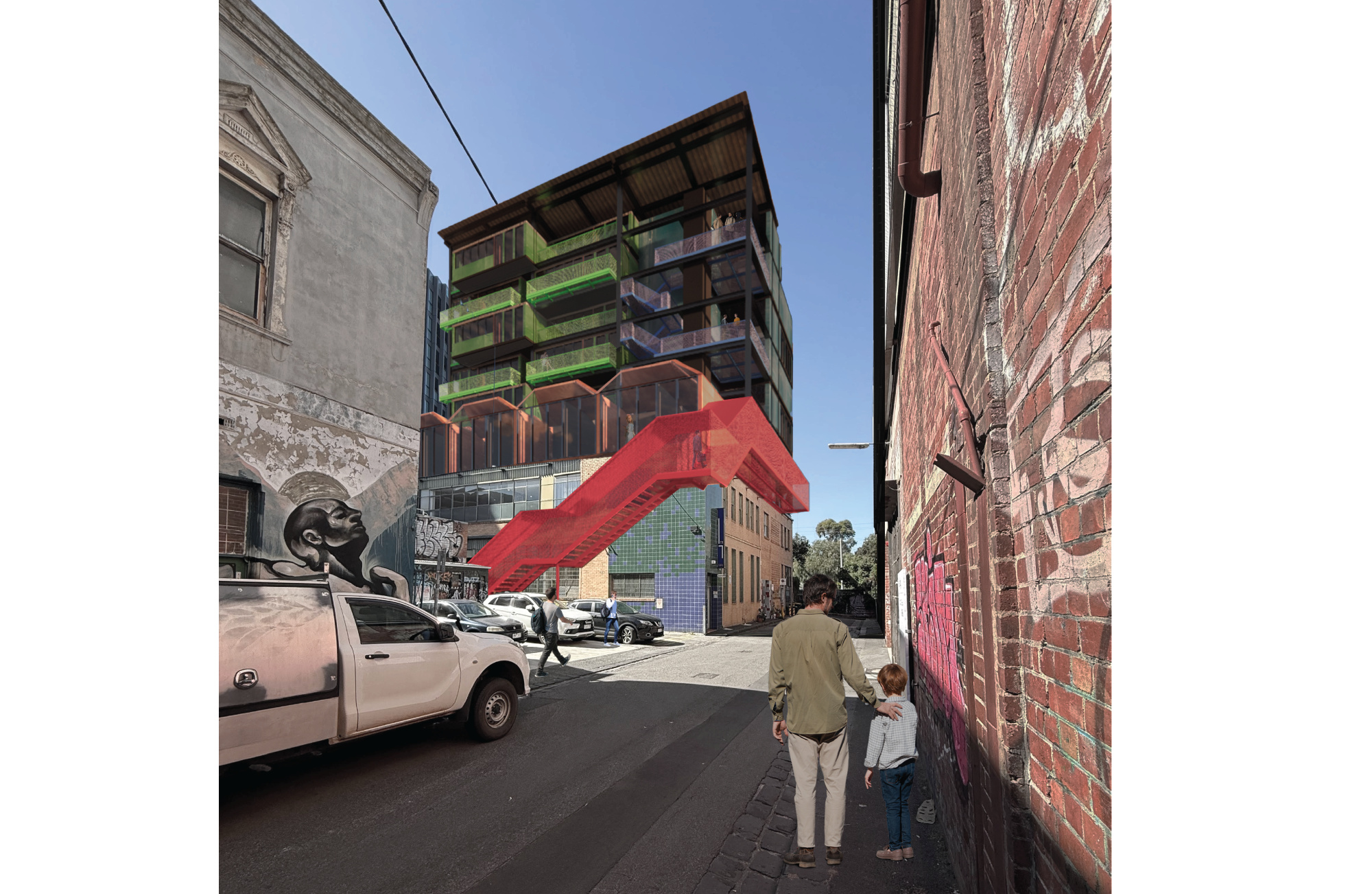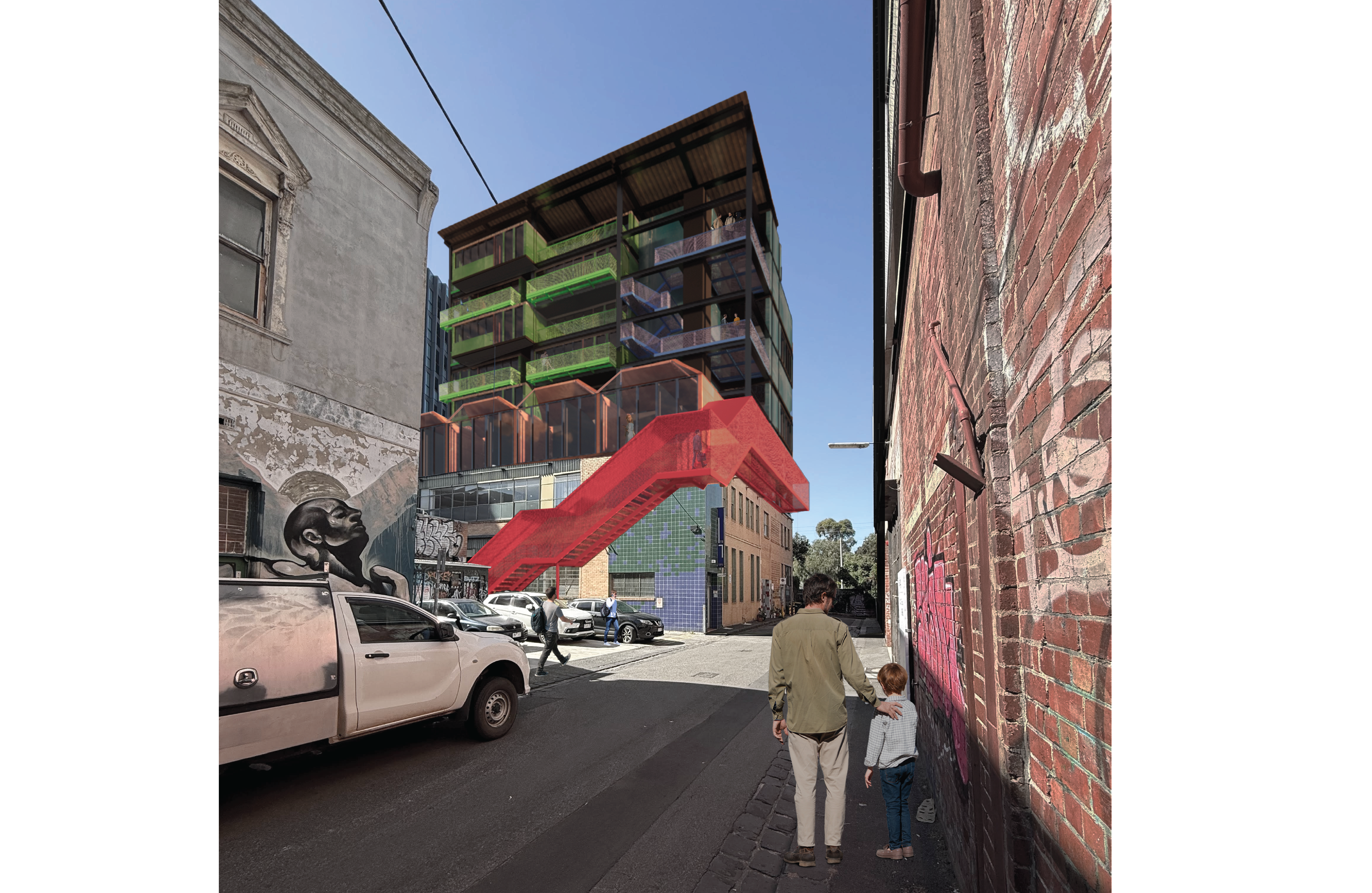 The project explored the use of coloured building 1 which identifies the different living typologies but also represent the creative individuals located in the Cremorne area and create a powerful visual statement in the area.