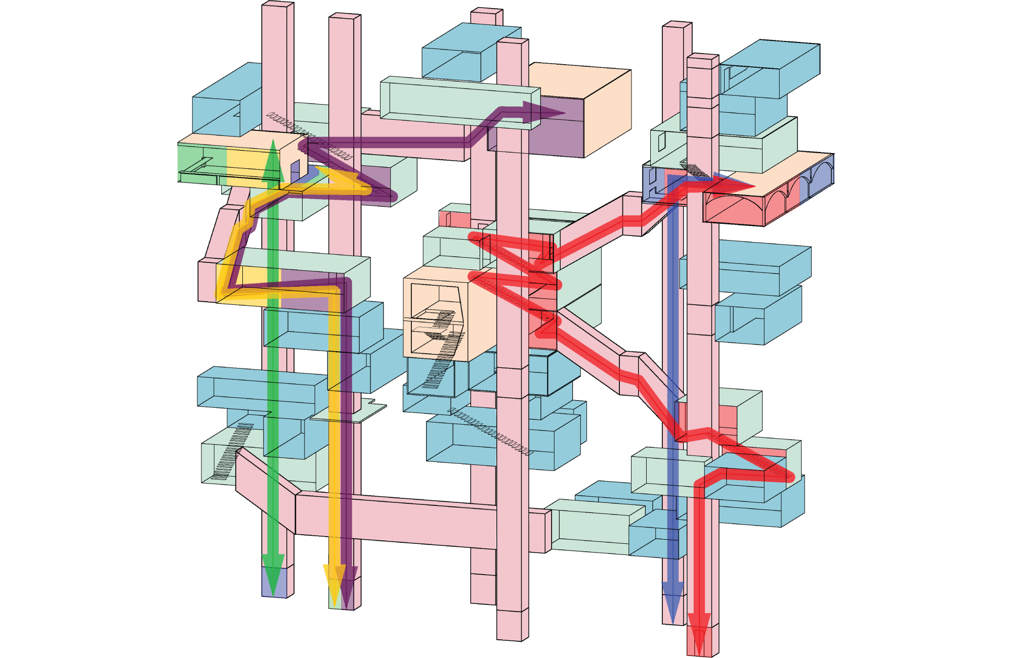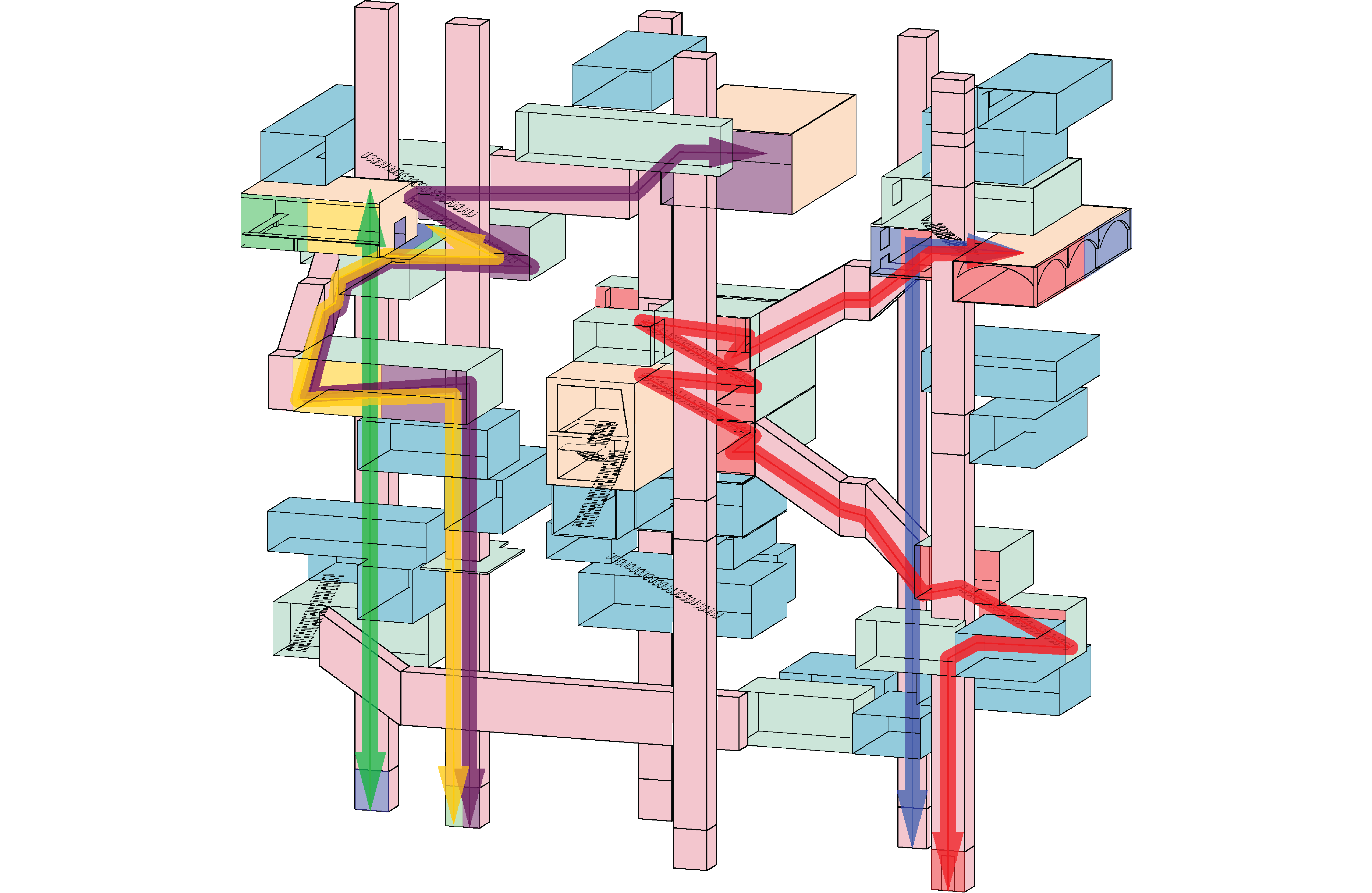 My project took on the idea that everyday we interact with data and it is constantly giving us choices to interact or not and this gave the idea to create many circulation paths to specific spaces within the building so that ones own choice has a differing outcome to another person while they still may end up at the same space eventually their paths are different.