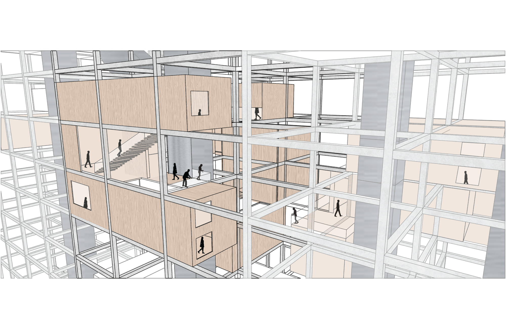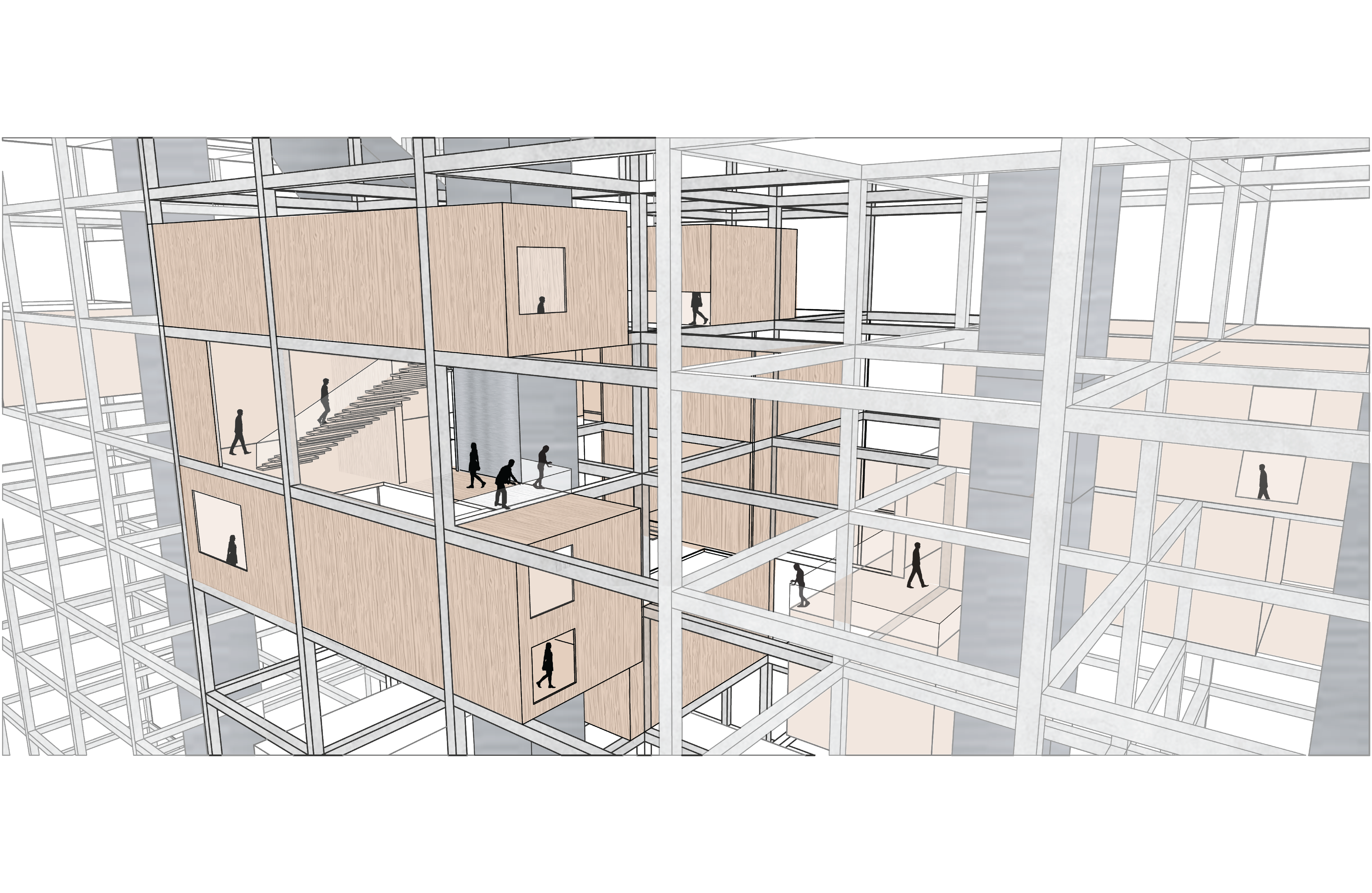 This studio focused on creating a data centre which also doubled as a civic centre in the heart of Melbourne CBD. My project aimed at creating floating or stacked boxes by utilizing the existing buildings structure. The floating boxes act as a reminder that data is always hanging around us. The floating boxes created a powerful visual in throughout the building, By doing this the data servers themselves can be hidden away amongst all the boxes while adding to the visual impact