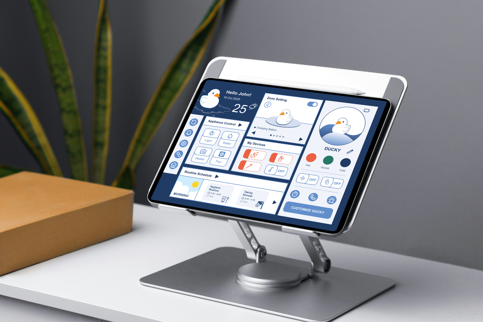 DUCKYS is a safety bathroom system that supports safe, intuitive bathroom routines for older adults. It combines sensor surfaces, a ducky companion, and a tablet application for remote control and customize.