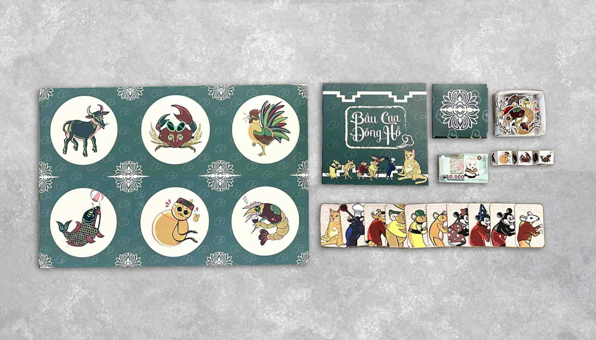 Bầu Cua Đông Hồ is a vibrant reimagining of the traditional Bầu Cua board game. This packaging design blends the timeless charm of Đông Hồ Vietnamese folk art with a bold, modern color palette.